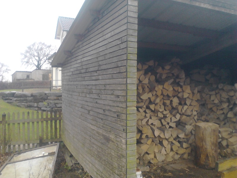 Wir haben 4 Billig-Carports (je ca. 250,-) nebeneinander gestellt und stapeln unsere Meterscheite dort. Allerdings haben wir wahrscheinlich nicht eure Schneelasten. Ringsrum Baustahlmatten gegen die Diebe, links und rechts je eine lange Reihe Holz, in der Mitte kann man durchfahren und auf- und abladen. Könnte gern etwas höher sein, vielleicht verlängern wir die Pfosten nochmal.