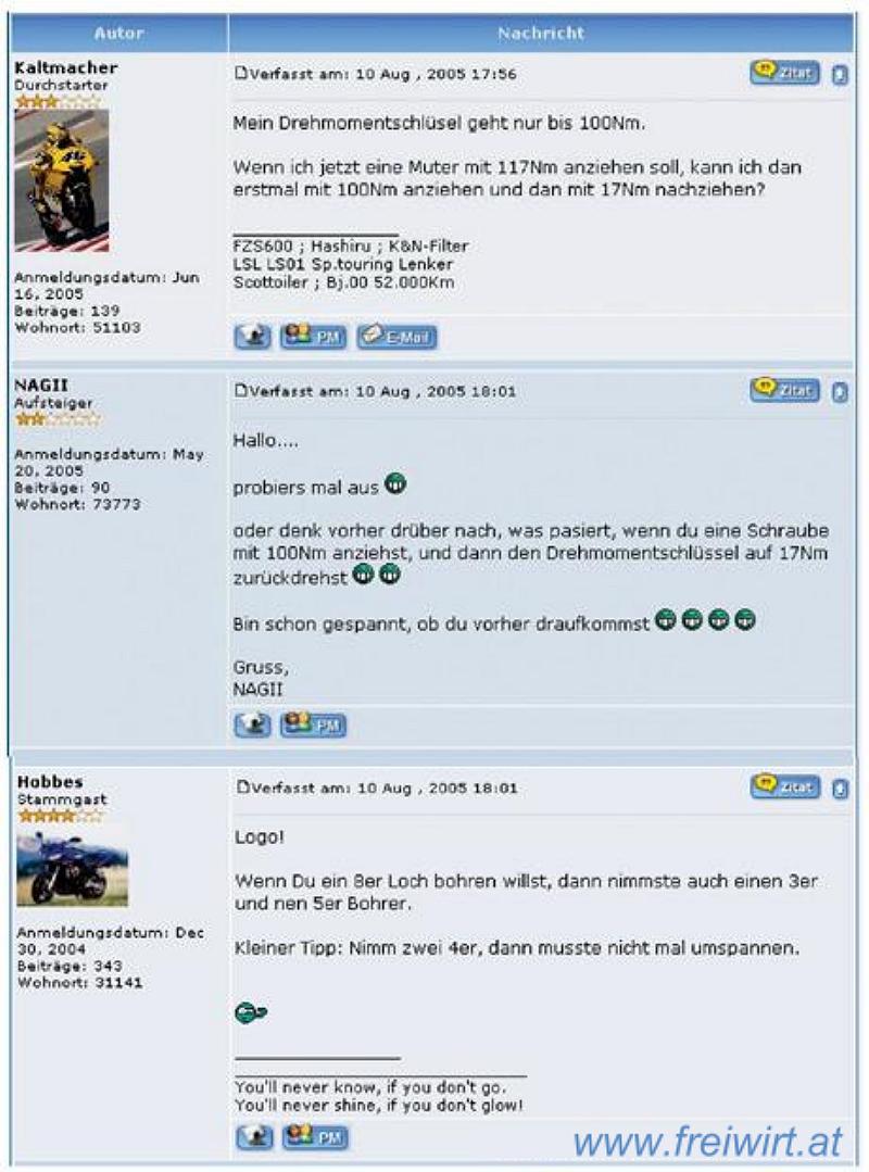 Lieber sterben als Lachen was?.Der eine oder andere Scherz gehört einfach dazu.Was soll daran verwerflich sein wenn man mal den einen oder andern Lehr oder Frischling hochnimmt?josefpeter hat geschrieben:Wenn in meiner Abteilung jemand so mit den Lehrlingen umgeht bzw. so von ihnen spricht dann kriegt der selbst ein Problem. So einen Schwachsinn macht doch nur einer mit den anderen, der es selbst zu nichts gebracht hat!