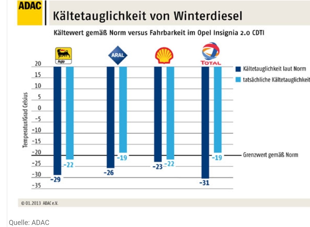 Auf dem normalen Winterdiesel (mit Bioanteil) steht: Bis -20 Grad.