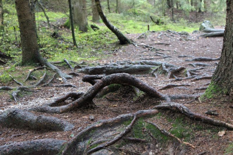 Der unbewachsene Hangboden wird stets abwärts gedrückt. Die Jungbäumchen sprießen natürlich zunächst senkrecht nach oben, werden dann umgedrückt und wollen wieder nach oben. Das geht so lange, bis der Boden zum Stillstand gekommen ist. Von da an wachsen die Bäume gerade.