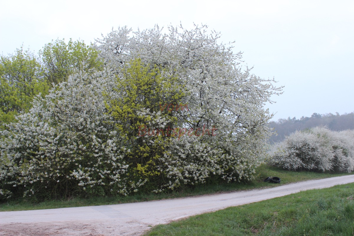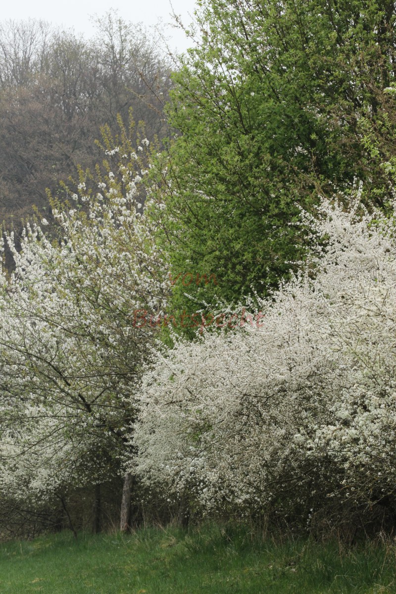 Die obere Hecke des Obstgartens mit u.a. Schlehen und Holzkirschen