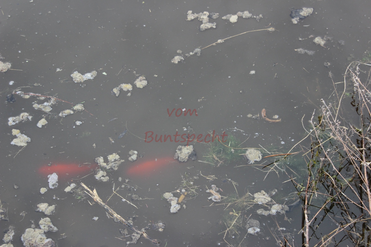 Kormoran, nicht erschrecken. Das sind die Reste der Population aus Weißfischen, Spiegelkarpfen, Kois und Goldfischen. In Kürze wird der Teich grundlegend umgestaltet. Auf zwei Seiten Stützmauern als 2 Meter hohes Trockenmauerwerk, gründliche Entschlammung und Anlage eines neuen Doms mit Überlauf. Gibt noch eine größere Baustelle