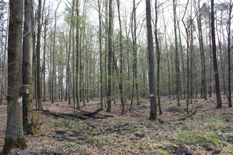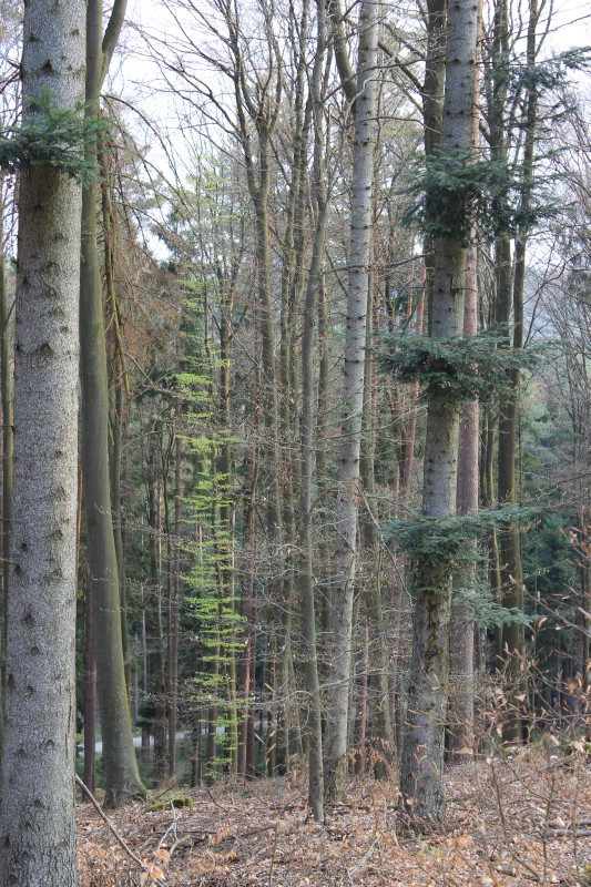Ein Blick in den vorwiegend mit Buchen bestockten Wald auf der Höhe unserer fränkischen Steigerwaldhochrücken. Man beachte den feuchten Waldboden. Trotz "Bergrücken" drückt es wegen Störungen im Untergrund das Wasser auf der Kuppe wieder heraus.