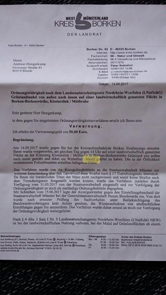 stamo hat geschrieben:Aus dem Schreiben geht doch für jeden Architekten schon hervor, dass die 50€ nicht für die Maus verhängt wurden. Wenn du das nicht erkennst, ist das Bildungssystem bei dir gescheitert. Auch aus dem Brief geht klar hervor, dass das vorsätzliche Töten der Maus nicht nachweisbar ist. Wäre es nachweisbar, hätte das mehr als 50€ gekostet.