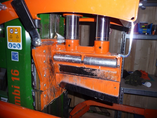 Auf dem 2. Bild ist der Hebel zu sehen, mit dem der Fixomat (unteres Teil vom Spaltmesser) ausgelöst wird und das Holzscheit fixiert.