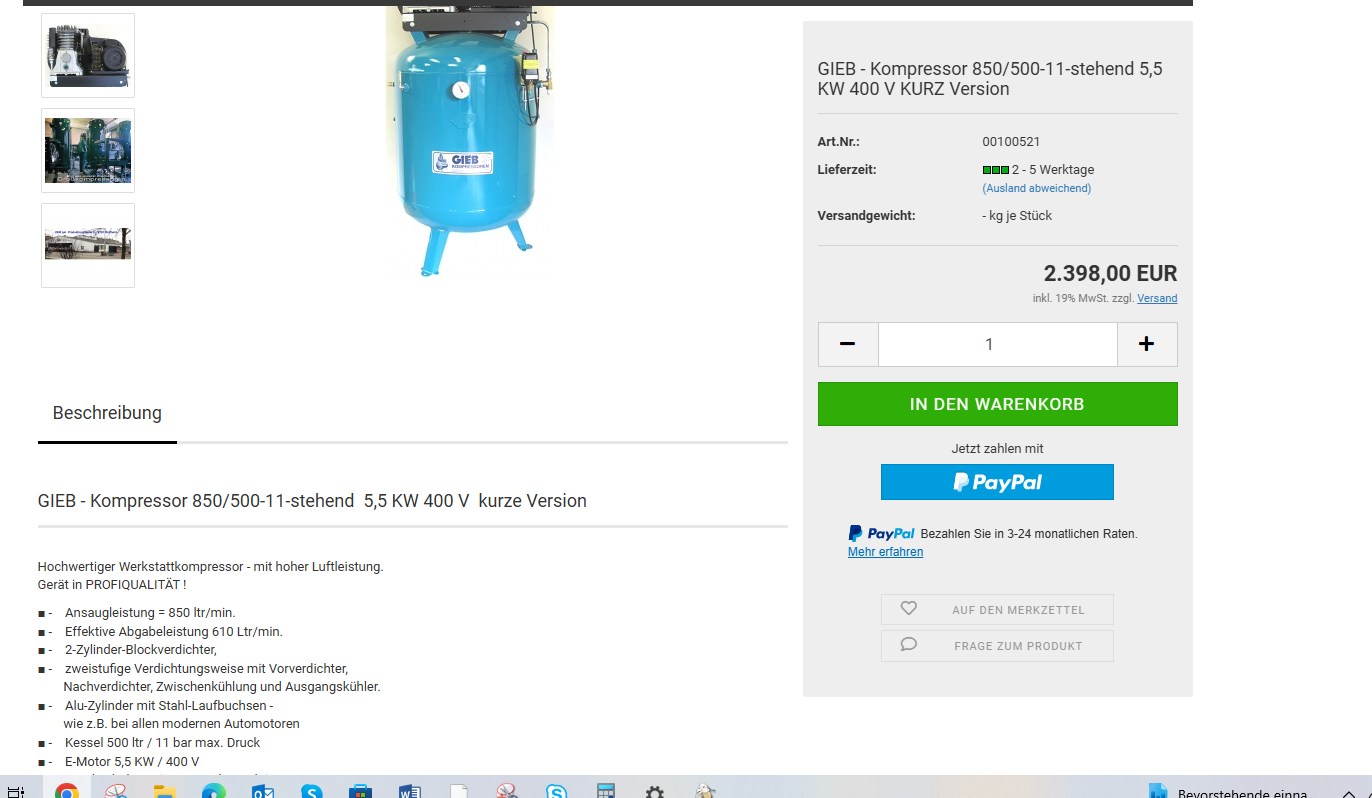 Habe jetzt einmal einen 2 Zylinder mit Riemen und 150l Tank bei 10 bar im Auge, Saugleistung ca 500l und Liefermenge ca 330l als 230V Gerät.