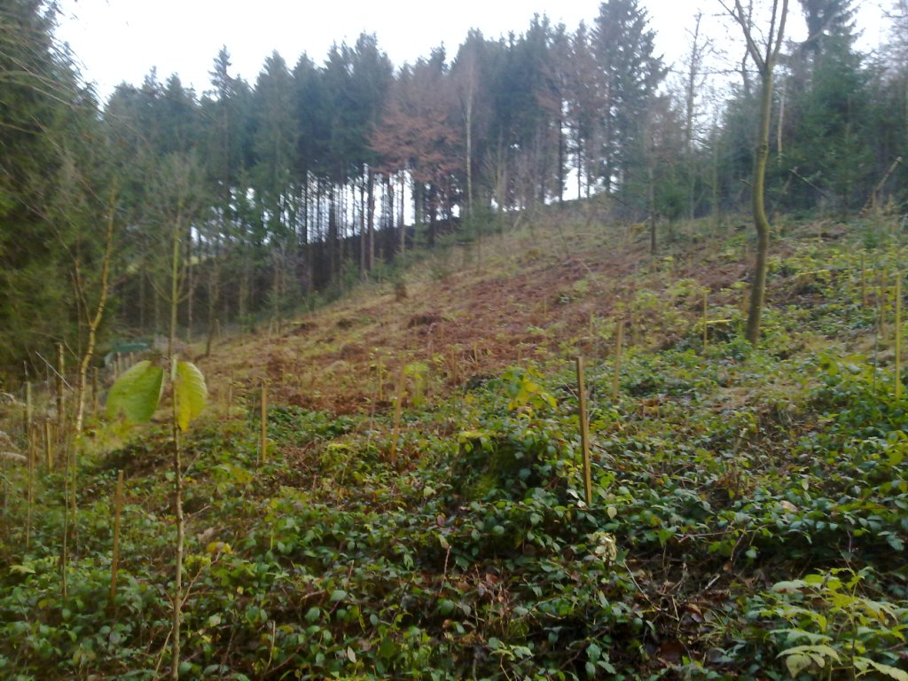 Wir haben nach Lothar auf 5 ha Kirsche und Spitzahorn (80cm) gepflanzt.... 3x1 m und auf 3 ha gar nichts (war aber auch noch keine Verjüngung da).