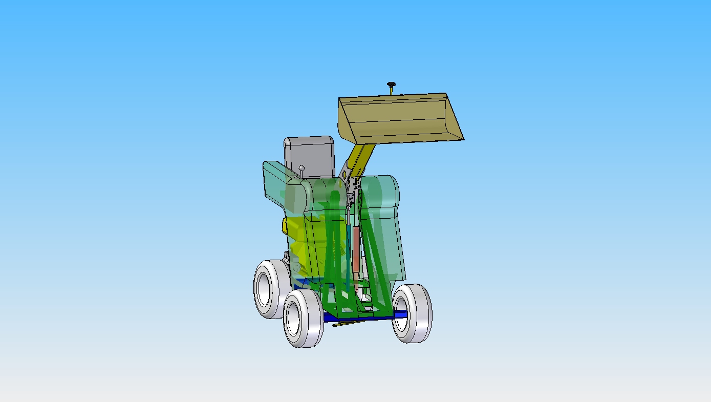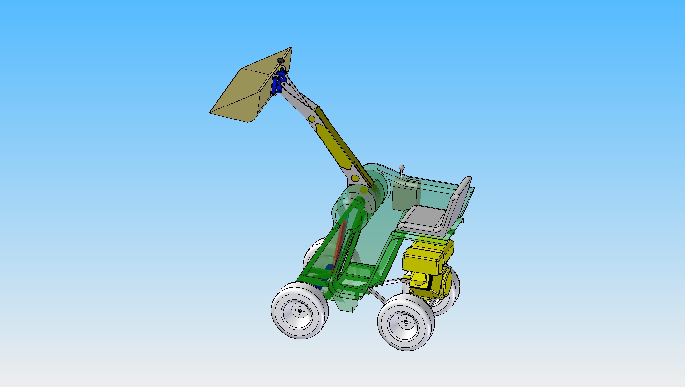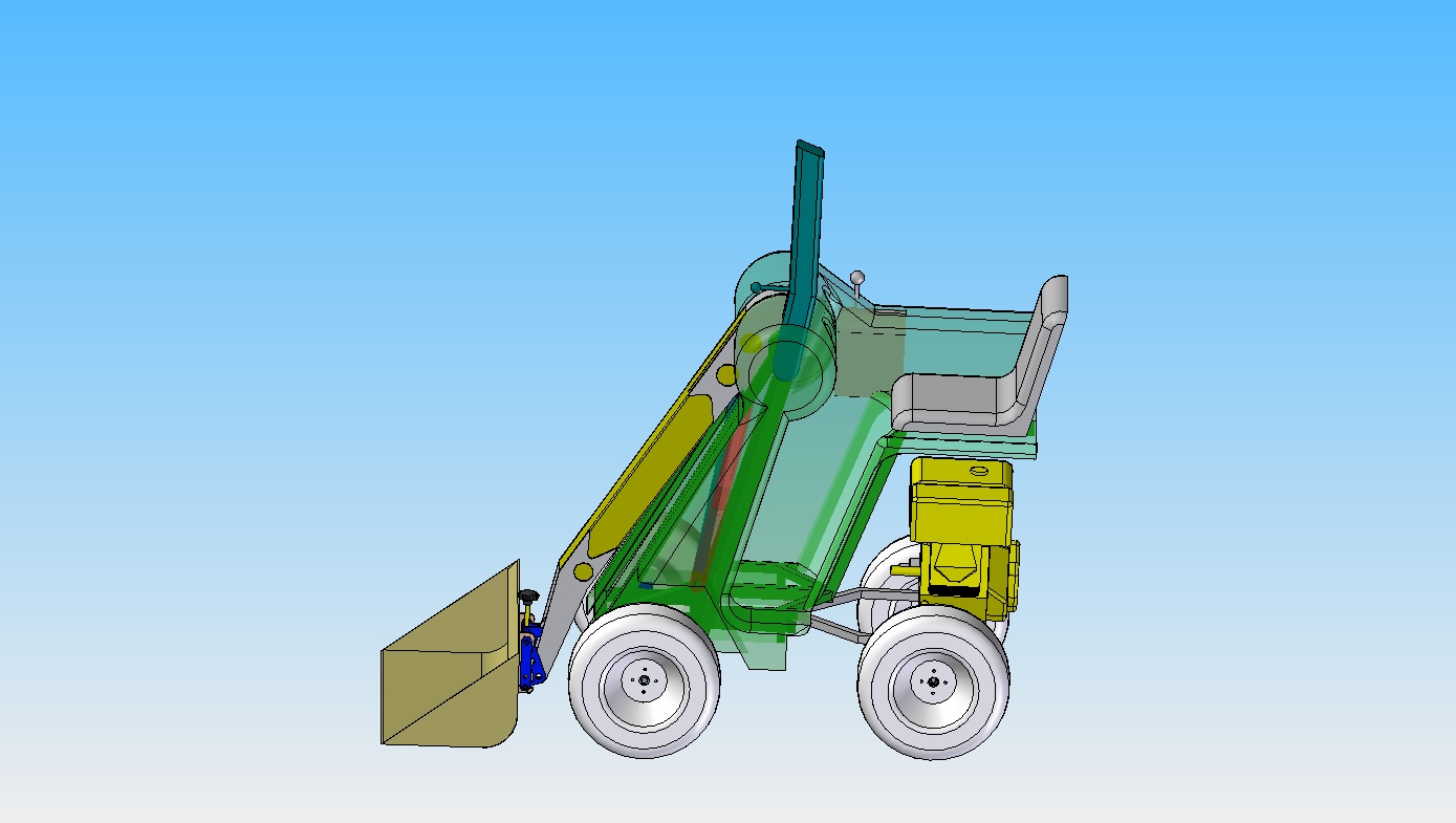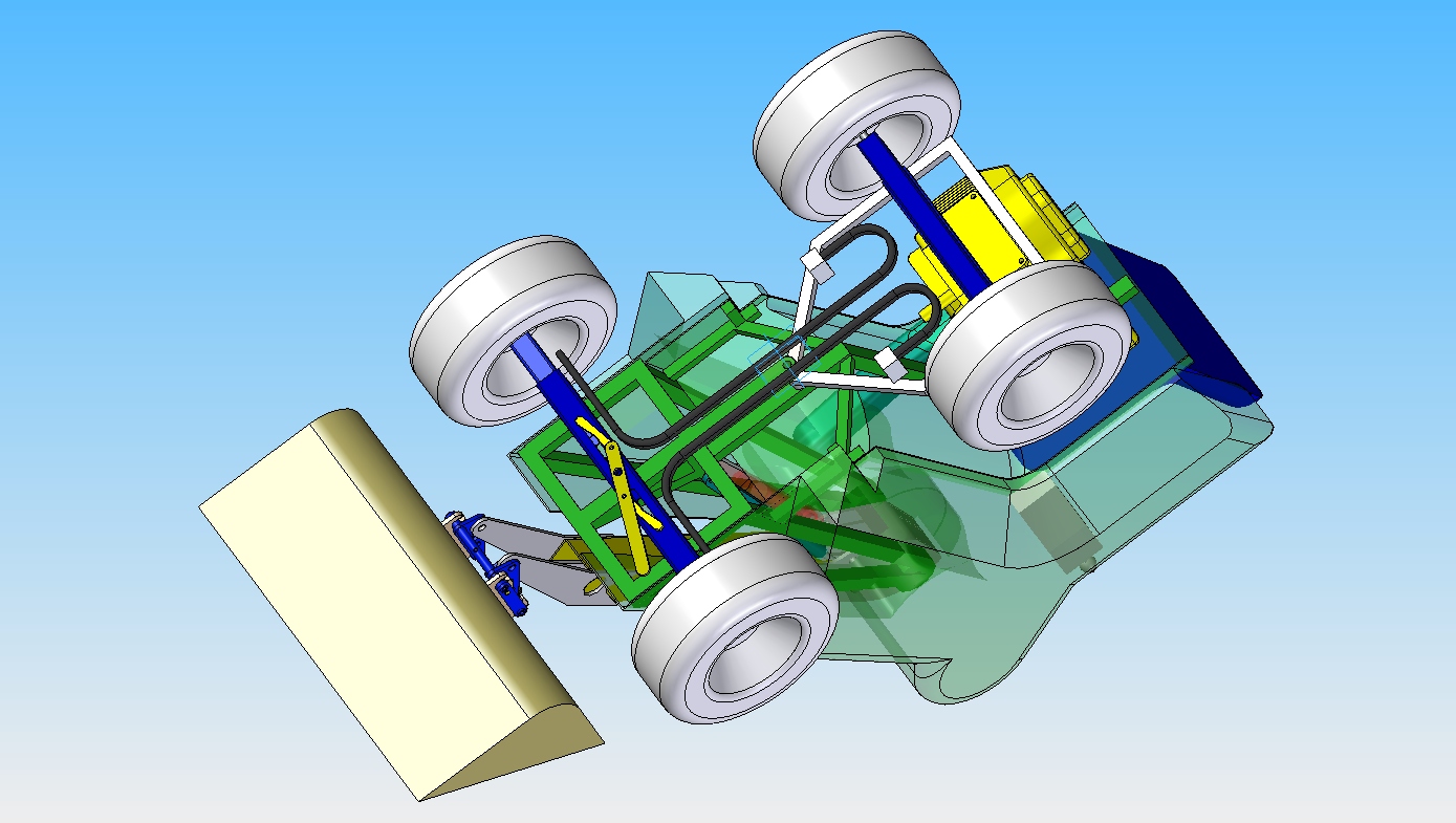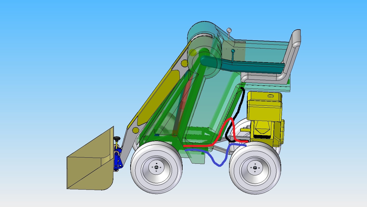 Ich habe auch mit der Konstruktion weiter gemacht. Heute habe ich die Lagerungen des Hubarms weiter optimiert. Dann habe ich mal grob eine Karrosserie entworfen. Jetzt kann man schon besser erkennen wie die Proportionen und die Ergonomie aussehen. Auf der linken Seite überlege ich eine klappbare Konsole einzubauen, diese Konsole soll einen Joystick tragen mit dem der Fahrantrieb betätigt wird. (Doch das kommt später).
