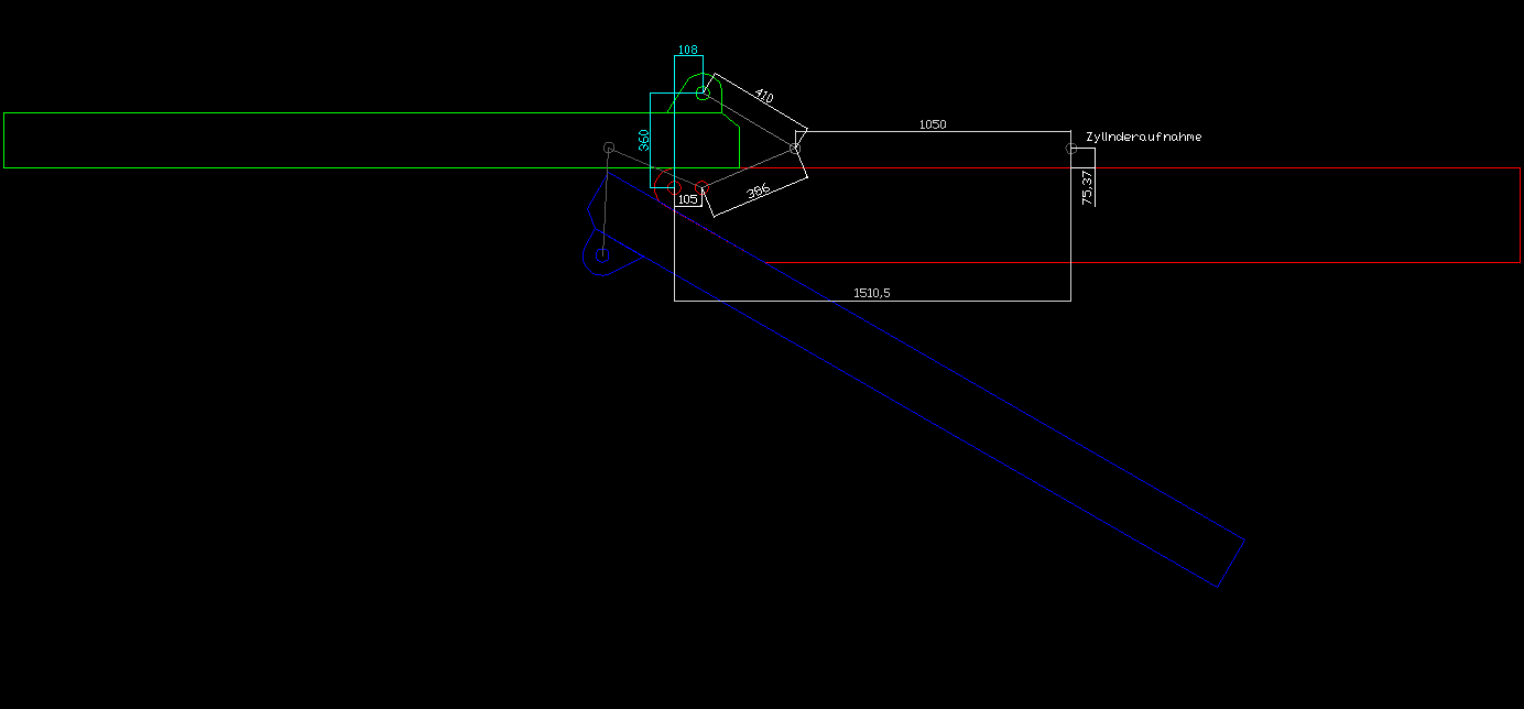 hab ich dir mal was gezeichnet. Ausgehend von deinen Maßen solltest du den Umlenkhebel 386mm (Augenmitte - Augenmitte) lang machen. Evtl. gebogen ausschneiden, wenn er irgendwie anstoßen sollte. Form ist ja egal, solange der Augenabstand passt. Die Schubstangen werden 410mm lang. Die Anlenkung in der Wippspitze musste nach hinten, sonst wär da ein Konflikt mit dem Zylinder. Bin mal davon ausgegangen, das der Kran bei eingefahrenen Zylinder keinen Knick aufweist. Um die Spitze um 150° zu schwenken (so das sich die 30° ergeben) müsste der Zylinder 710.5mm ausfahren. Ich denke, den halben mm kannst verschmerzen.