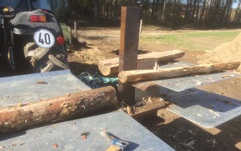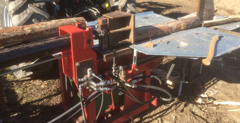 Das Messer ist hydraulisch in der Höhe verstellbar, da ich dann bei dickeren Stämmen (siehe Bild 8 ) nur einen Teil abspalte, dieses wird im Bündelgerät abgelegt und der größere Teil wird wieder mit dem Sapie zurückgezogen und nochmal durchgedrückt.Bei den kleineren Stämmen(so 20er) wird das Messer auf Mitte gefahren und somit der Stamm geviertelt. Bei ganz Kleinen wird das Spaltmesser ganz runter gefahren und wird dann nur noch halbiert. Es ist ein doppelter Tisch, einmal der untere Tisch und einmal der obere, der am Quermesser vom Spaltkreuz befestigt ist.