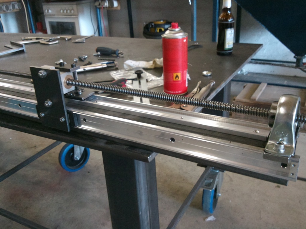 Hab auch mal was gebaut...Führung / Vorschueinheit für meinen Plasmaschneider. Verspreche mir davon ein sauberes Schnittbild und vorallem GRADE schnitte Am ende der Gewindestangen sind 6kant muttern..So kann ichs bequem mit´m Akkuschrauber verfahren. War erstmal die günstigste und zweckmäßigste lösung
