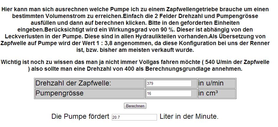 hab mir das mal angesehen, hier die Erklärung: bei der Berechnung von ZWG.de wird zuerst mal das Fördervolumen ausgerechnet, indem die Drehzahl mit der Fördermenge/Umdrehung berechnet wird. Und davon dann 90%. Ob man das so rechnen kann, lass ich mal dahingestellt, denn die tatsächliche Fördermenge ist druckabhängig (je mehr Druck, desto mehr volumetrische Verluste durch Lecköl innerhalb der Pumpe). Bei meiner Berechnung ist da erstmal noch kein Wirkungsgrad dabei (was auch nicht ganz richtig ist, aber es geht hier ja um Holzspalter). Siehst du ja auch an den unterschiedlichen Ergebnissen bei der Fördermenge. Bei ZWG.de wird nun das Produkt aus den 20.7 L/min und den Druck von 220Bar gebildet und anschließend mit Faktor 540 dividiert (90% Wirkungsgrad). Auf der anderen Seite steht dann analog dazu 23.04 L/min x 220 : Faktor 510 (85% angenommener Gesamt-Wirkungsgrad).