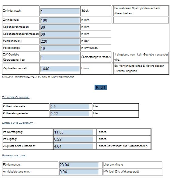 Hallo Markus, danke für die Erklärung. Ich bin da nie so richtig rein gekommen in die Materie und tue mich einigermaßen schwer mit solchen Berechnungen. Daher war ich ganz froh, dass es solche Berechnungstools gibt. Halten wir also fest, dass das Ergebnis von deinem Tool genauer/realistischer ist. Demnach könnte ich doch eine 14ccm Pumpe (8,7kW bei 220bar) einbauen. Die Taktzeiten überzeugen mich zwar immer noch nicht, und ich wunder mich, wie so mancher 4kW Spalter ohne Doppelpumpe schneller sein kann...