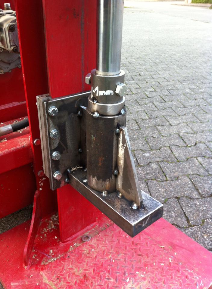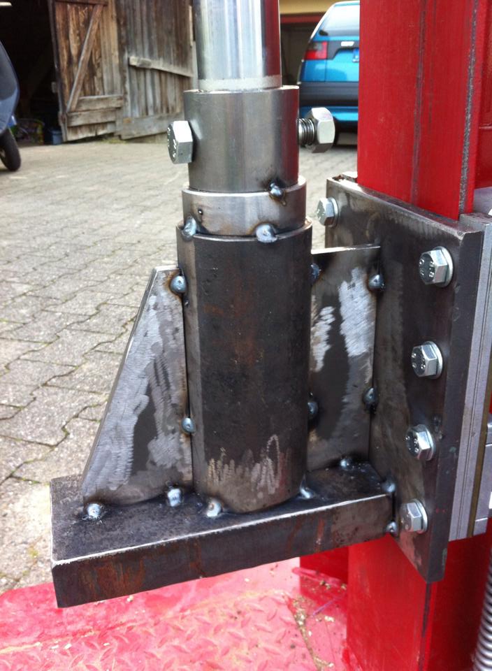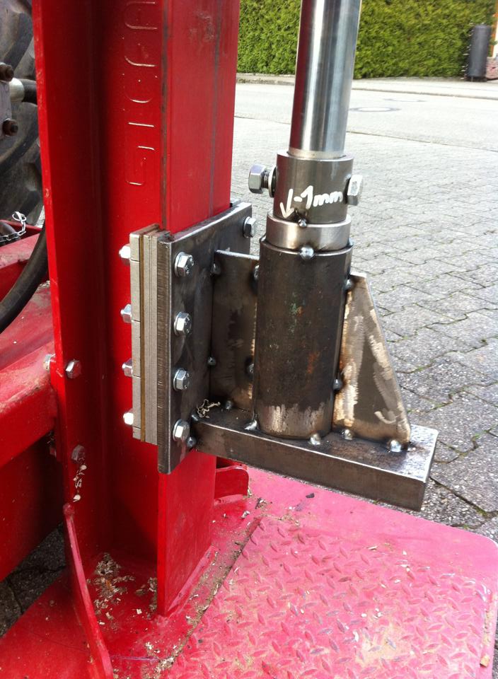 ja die Krangeometrie ist auch für mich ein kritischer Punkt gewesen. Lange habe ich überlegt, ob ich den "Knickzylinder" auch hinter den Arm einbauen soll. Dadurch ist dieser viel mehr geschützt. So war es für mich einfacher. Ein Nachbar von mir hat auch diese zylinderstellung auf einem Anbaukran. und ich muss sagen es hat mich bis jetzt noch nicht gestört. Darüberhinaus kommt ein Schutzblech mit Führungsring auf den Zylinder, um diesen gegen pendelnde Bäume zu schützen.