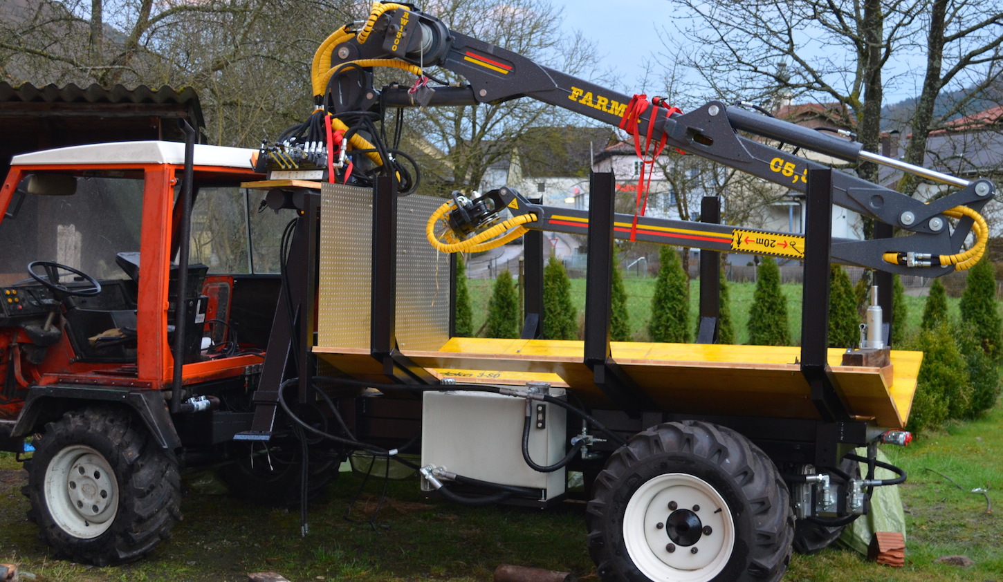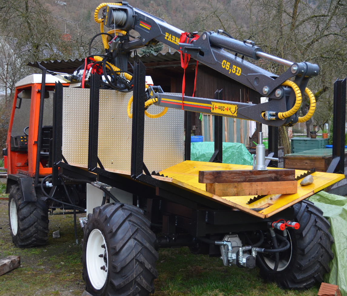 Deutz DX 85 mit Forstkran KTS 6,30. Rückewagen Eigenbau 4 T. Hydraulische Winde Eigenbau für den Frontanbau . Fendt GT für Hackschnitzelbunkerbefüllung und Schneeräumen. 2 Hänger Stihl 044 Stihl 035C
