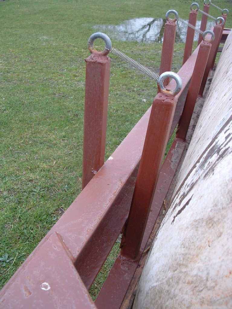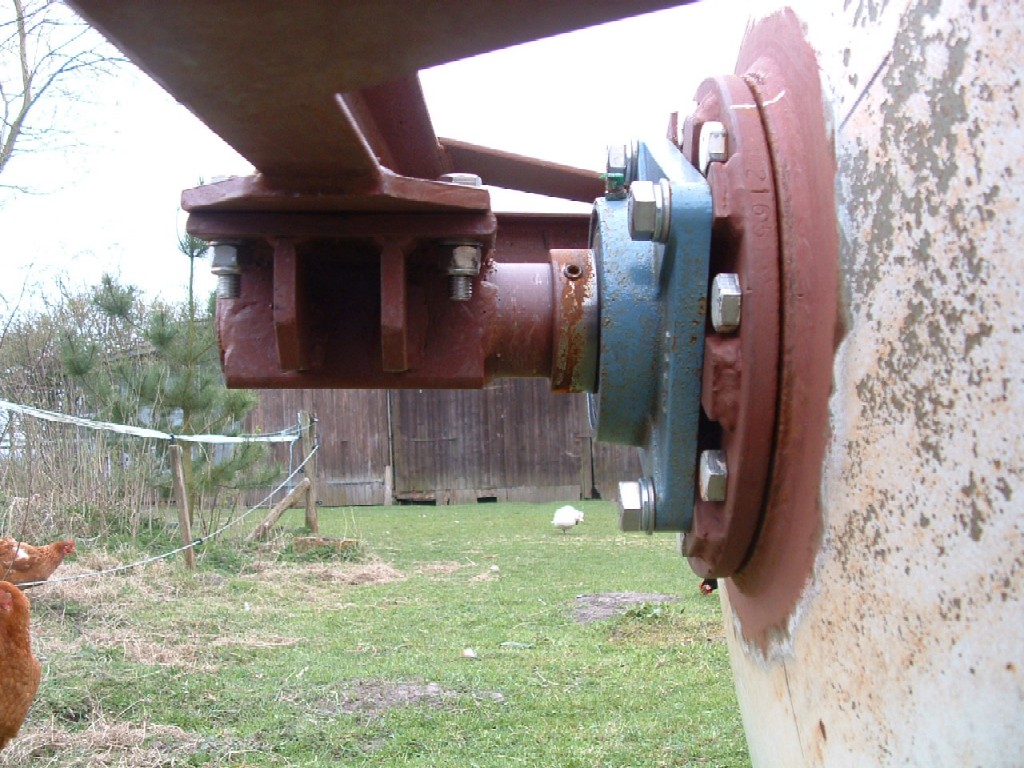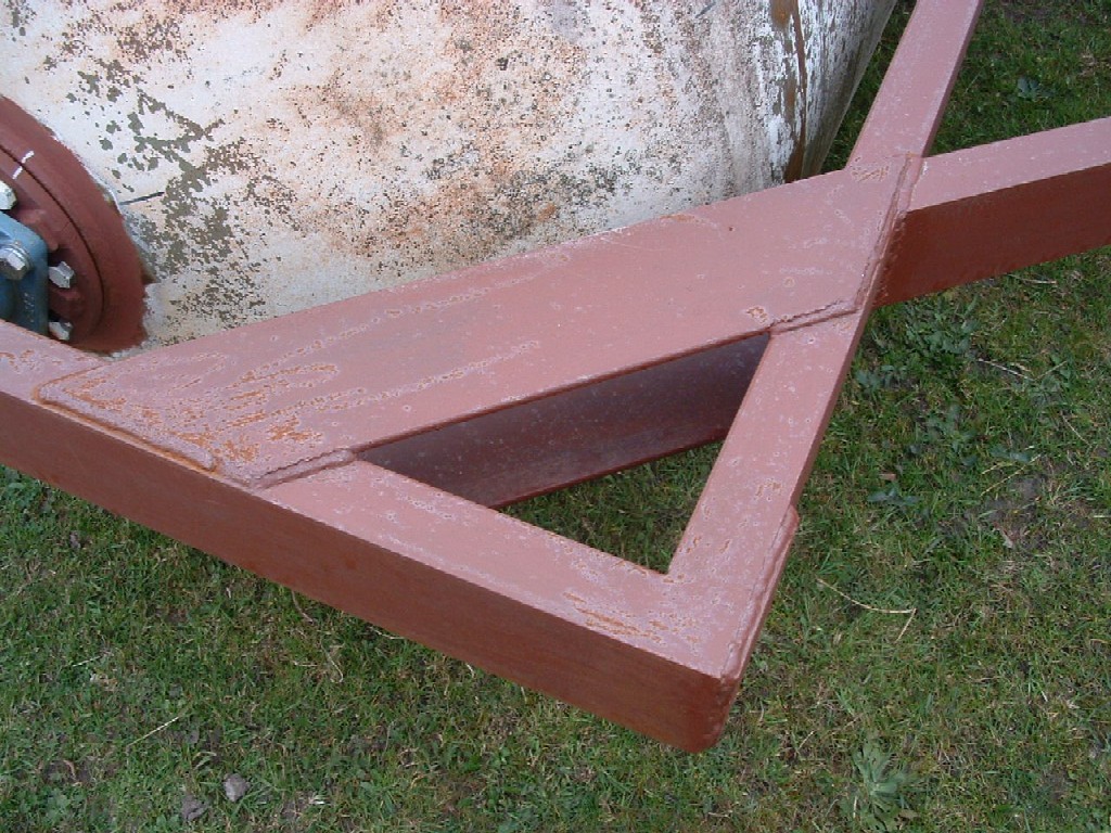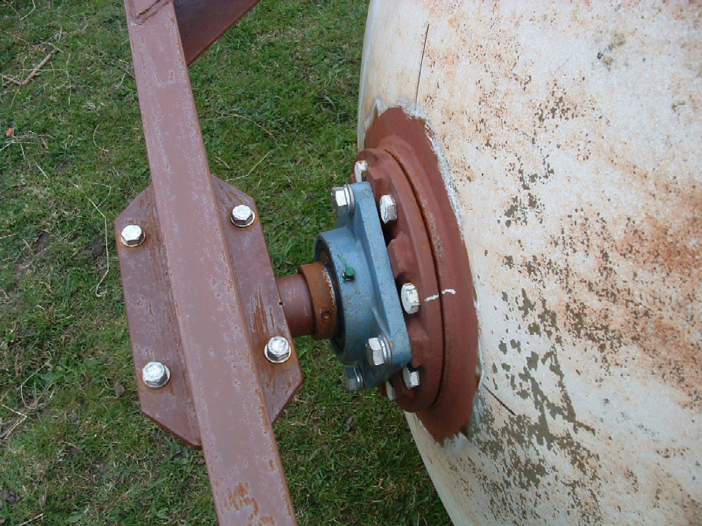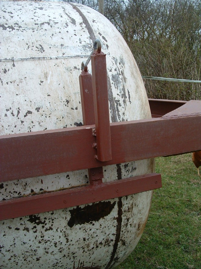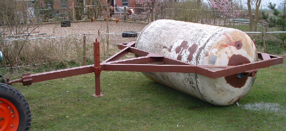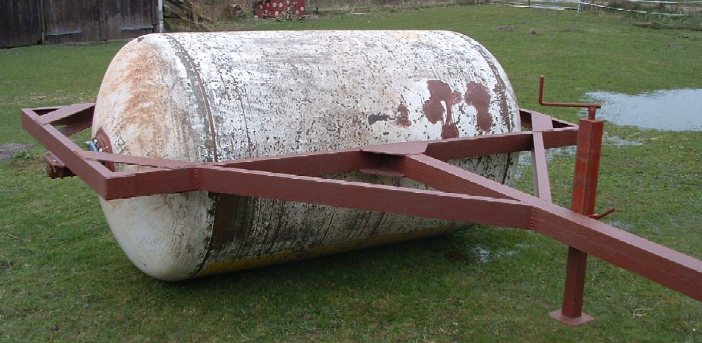 Basis ist ein 2700-Liter-Flüssiggastank. Diesen bekommt man gespült von einem Flüssiggas-Versorger. Der Durchmesser von 1,25m und die gerundeten Kanten finde ich für eine Walze als vorteilhaft. Die nutzbare Walzbreite beträgt knapp 2m und deckt damit gerade die Fahrspur meines Favorit 3 ab. Sicher wäre eine größere Breite schön gewesen. Aber dann wird die Gesamtbreite zu groß für die Tore. Diese beträgt jetzt 2,95m. Ich verschenke also an der Seite ca. 30cm Abstand zu Zaun o.ä. Das ist für mich aber nicht so schlimm. Ich finde die runden Kanten eher vorteilhaft, weil einige der zu walzenden Flächen eher klein sind. Es müssen also viele Wendungen gefahren werden. Das läuft so super. Selbst bei sehr engen Turns und losem Boden (z.B. Reitplatz) frist sich die Walze nicht fest.