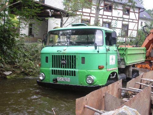 DA die Bauabschnitte zum Teil 90m lang waren, wurde eine Einfahrt gebaut ,von wo aus reingefahren wurde. Da der W50 den Luftansaugstutzen noch vor dem Kühler hat, gab es keine Probleme mit Wasser ansaugen.