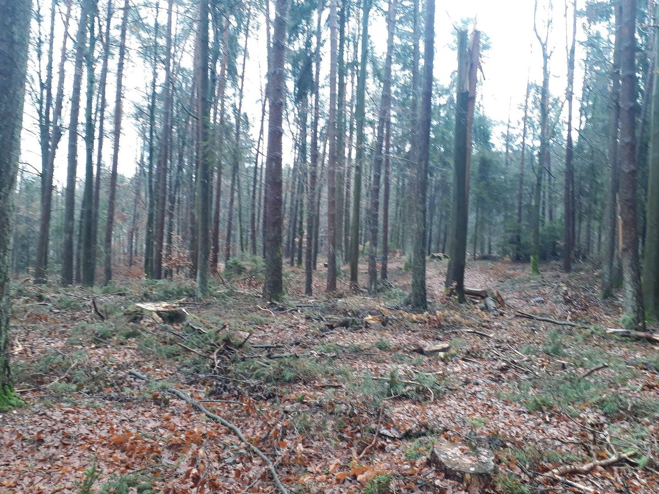 Hier mal ein kurzer Blick (Zugrichtung Fabienne) durch ehemaligen Fichtenbestand mit ca. 10% anderer Baumarten in Richtung Mischwald, größtenteils Kiefer und Buche, Fichte ebenfalls mit starkem Anteil und etwas Eiche. Überlege mal welcher Wald auch in Zukunft etwas Geld abwirft!