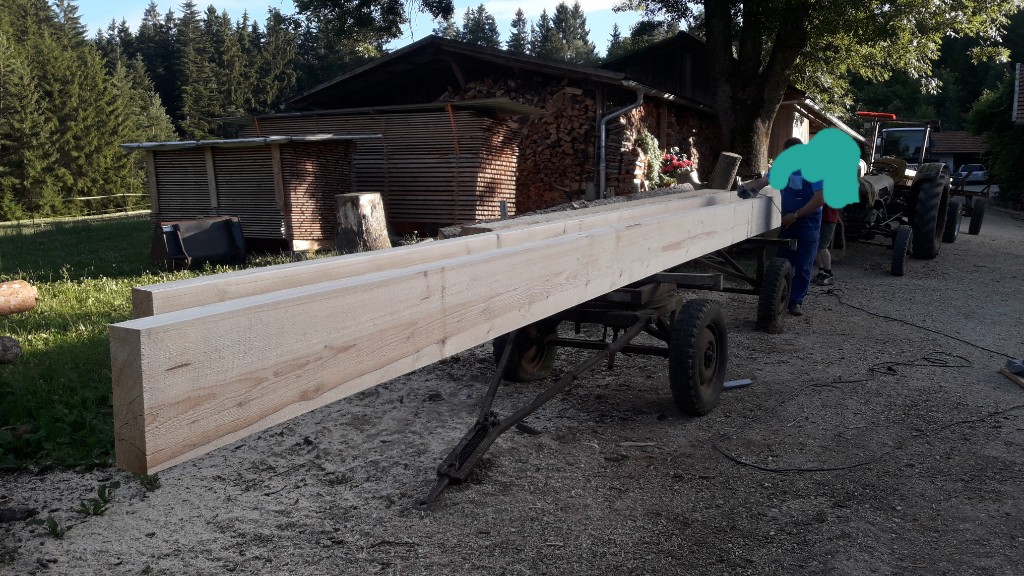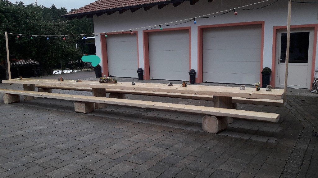 Hallo Mein Vater hat seinen 50ger gefeiert mit der Aussage er lädt nur einen Tisch voller Leute ein . Deshalb hat er sich eine Garnitur aus einem Fichtenstamm schneiden lassen mit 10m Länge es wurden 4 Balken mit 34cm x 10cm und noch ein paar Füße für die Bänke und den Tisch . Platz fanden an dem Tisch knapp 40 Leute .