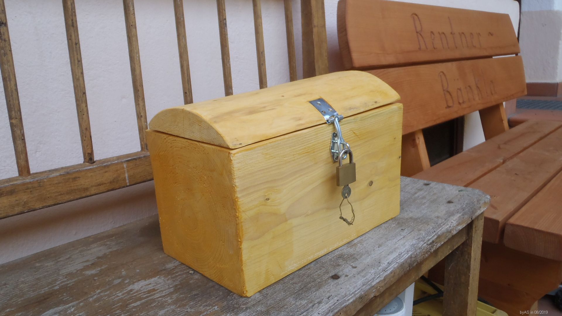 Bemerkenswert auch die Bank, auf der die "Schatzkiste" steht. Das ist ein erhaltenes Stück der Eckbank von der Erstaustattung der Einrichtung des Hauses von anno 1898. Gefertigt vom Urgroßvater mütterlicherseits. Im Hintergrund das "Rentner Bänkla", das ich beim Forumstreffen letztes Jahr von User M. geschenkt bekommen habe ...