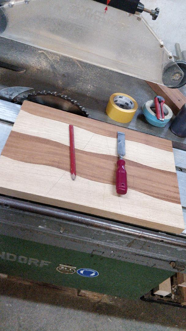 Nach einem Jahr auch nochmal in der Werkstatt gewesen und ein ,,Drunken Cuttingboard" gemacht. Eiche aus dem eigenen Wald und das rote ist aus alten Fenstern und müsste Bangkirai sein