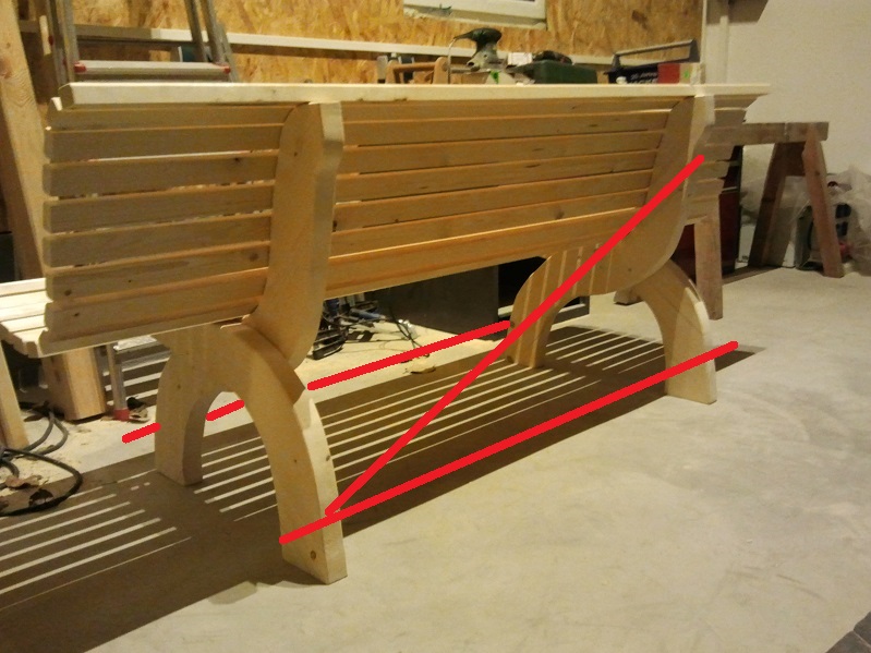 Ich hab schon ein paar dieser Bänke gebaut, aber es tut sich bei mir immer wieder die Frage auf, wie ich die Diagonale zwischen den Füßen wohl am besten einbaue.