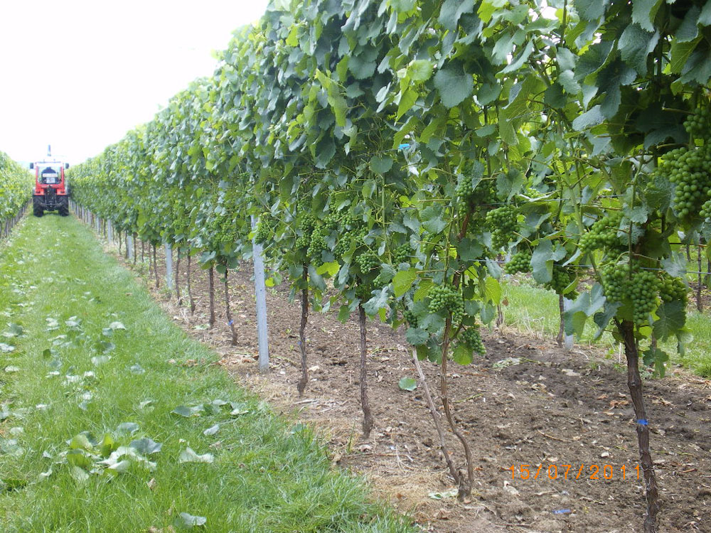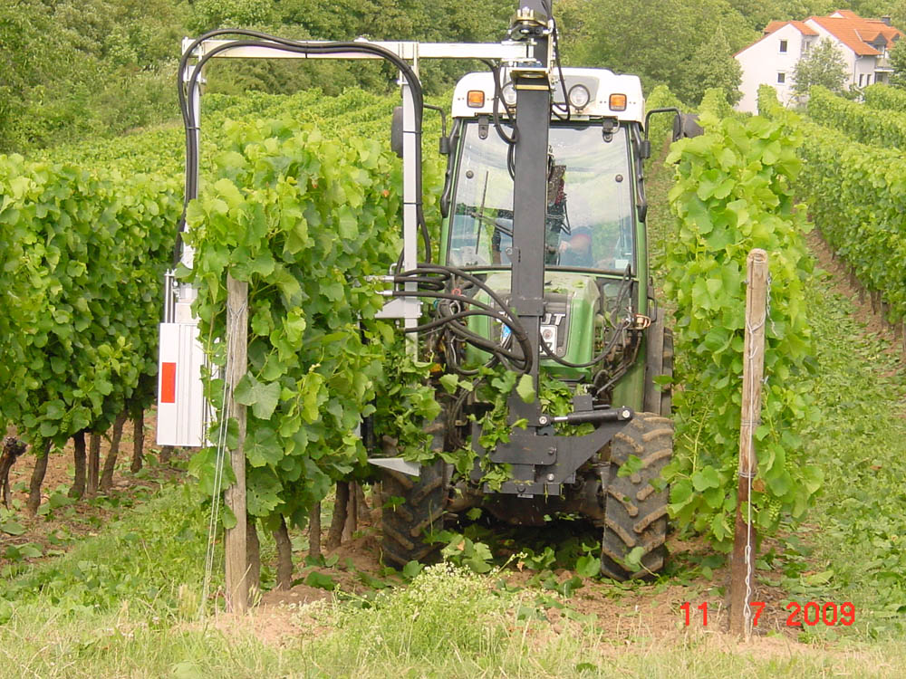 Zum Binger: Bin auch relativ spät gefahren (Mitte Juli), daher hatte ich bis zum Herbst eine freie Traubenzone. Trauben wurden nur sehr wenig beschädigt.Teilweise gab es kurze Triebe die kaum mehr Blätter hatten. Aber logisch; wenn ein Trieb anliegt, kann der Trieb dahinter nicht mehr entlaubt werden. Zum exakten Fahren: Die Abtastung funktioniert super. Man stellt an einem Weinberg die "Arbeitsbreite" einmal ein. Eine Feder gleicht dann Unebenheiten oder Ungenauigkeiten beim Fahren aus, so dass der Kopf gleichmäßig an der Laubwand entlang fährt. Ich fand dieses System das bessere.