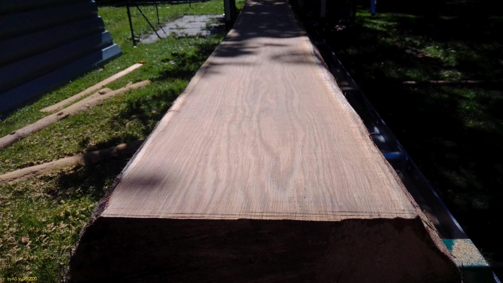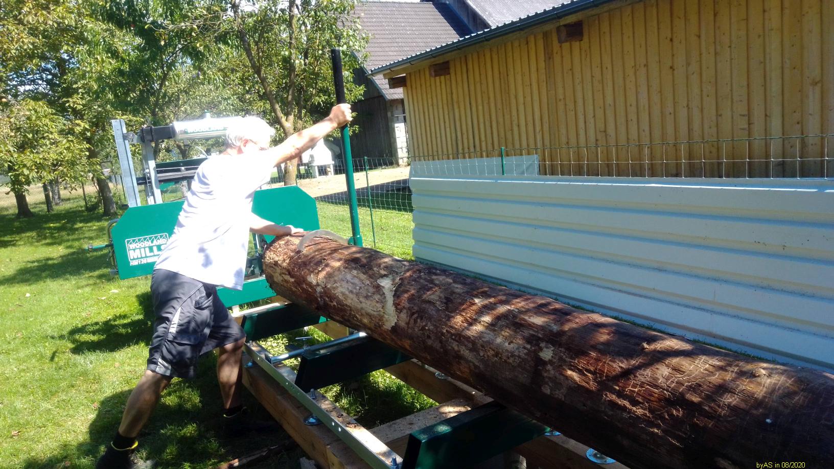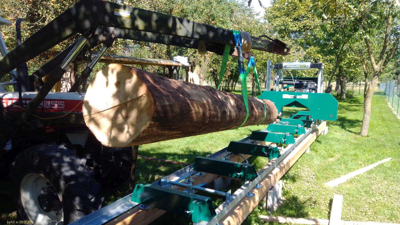 Die Kiefer im letzen Bild mit nur etwa 10 cm Schnittbreite, fast neuem Band und 14 PS Motor ging mit langsamer Schrittgeschwindigkeit, also knapp 1 m/s.