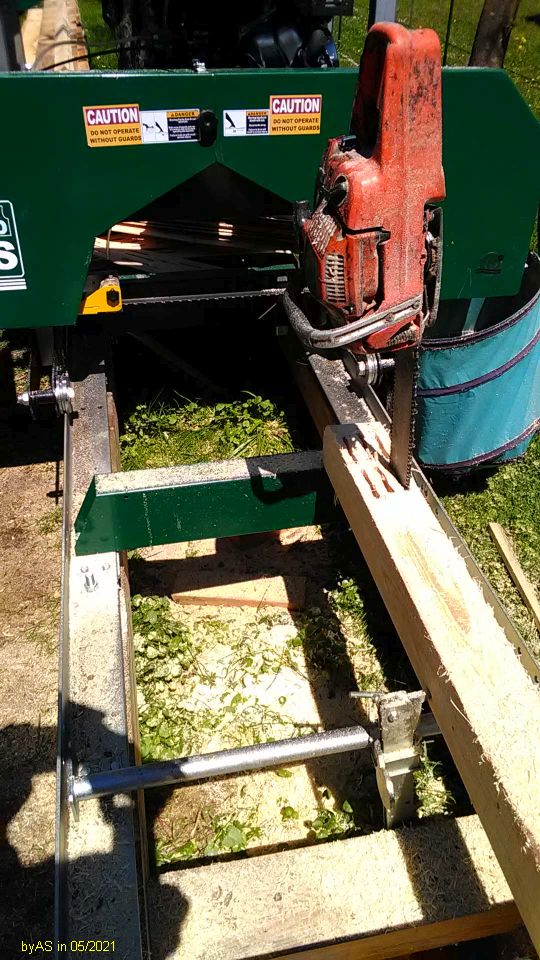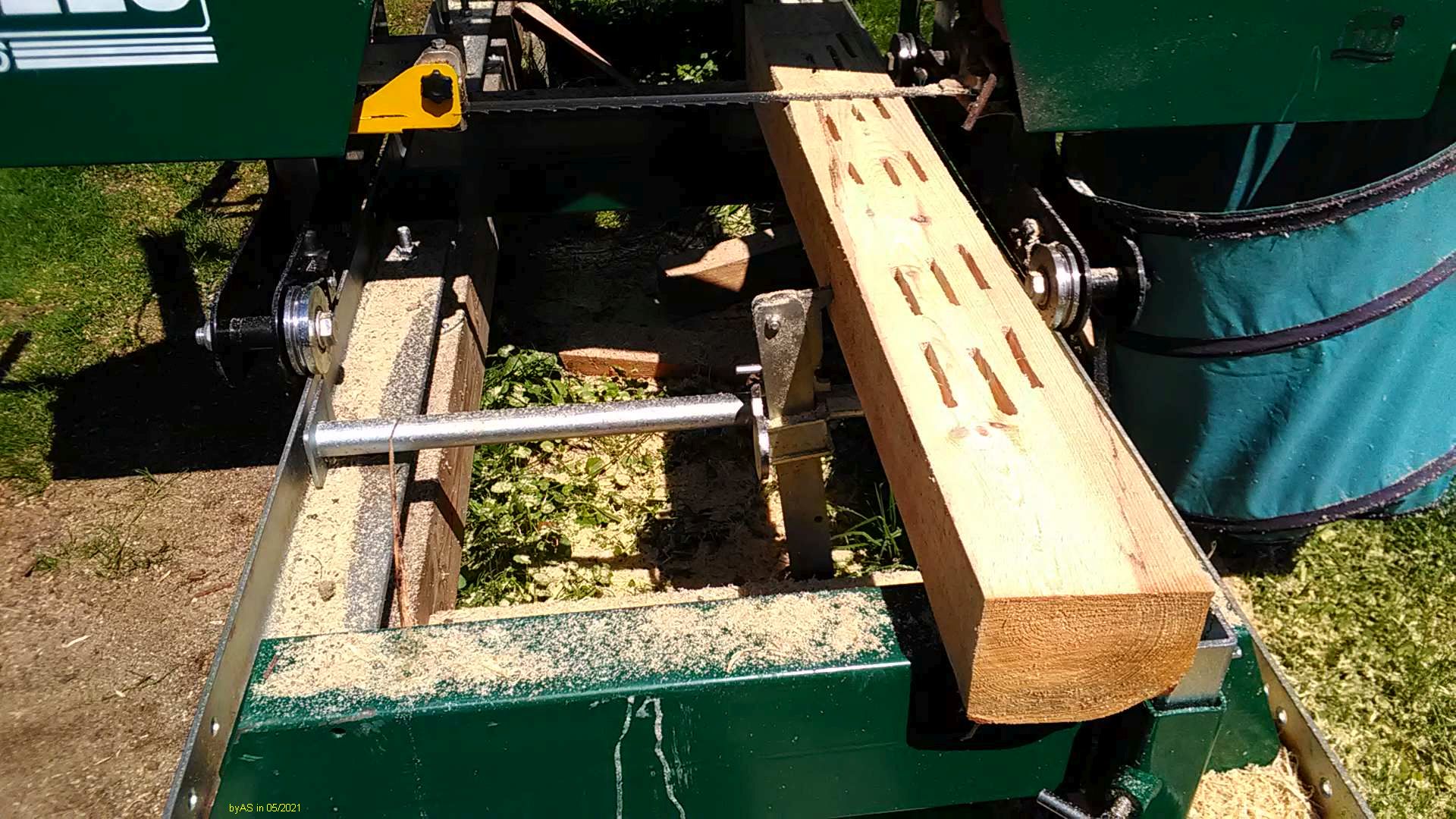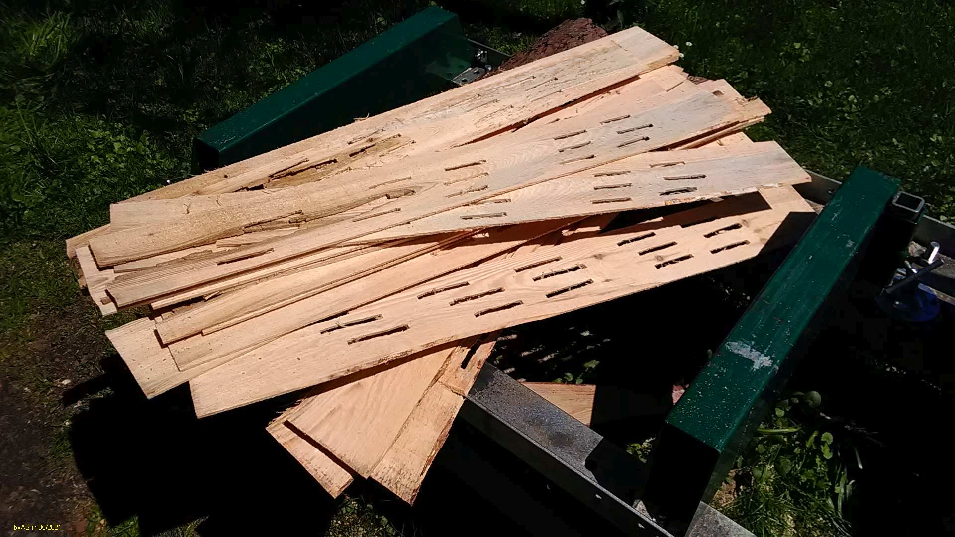 Also hab' ich kurz überlegt, wie das schneller ginge. Schlitze durch Einstechen mit der Motorsäge schneiden. Vor dem Sägen in dünne Brettchen!