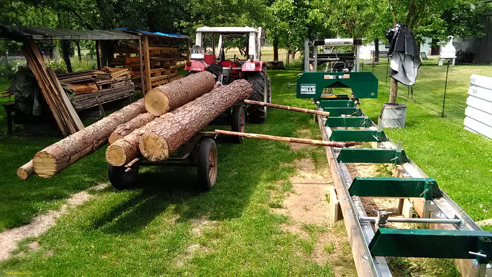 Das Umladen vom Gummiwagen auf das Sägebett geht natürlich auch ohne Kran ...