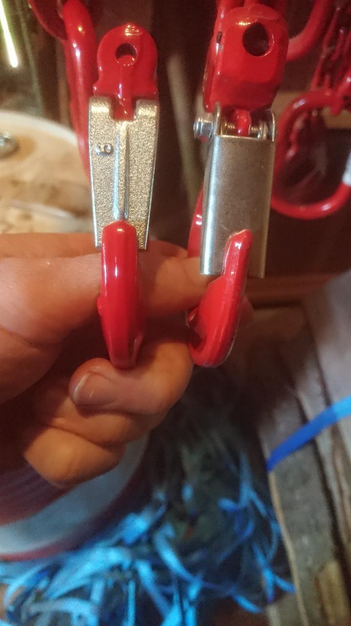 ich meine auch, dass du sowohl mit dem bisherige Hacken als auch mit dem Schlinghacken dein Drahtseil vergewaltigst. Die Seilgleiter, wie sie Falke zeigt gibt es auch mit kleiner Rolle. Interresant wird es erst, wenn du die Ketteneinhängeöse durch ein Parralellhacken ersetzt. Schnell und einfach aus- und einzuhängen