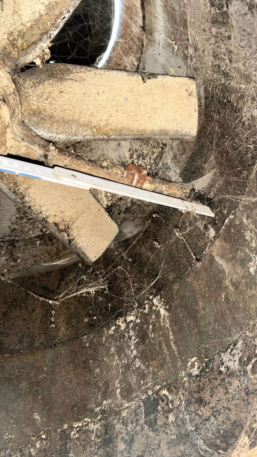 Deshalb hängt der Lüfter schräg und die Lüfterflügel streifen am Schacht.