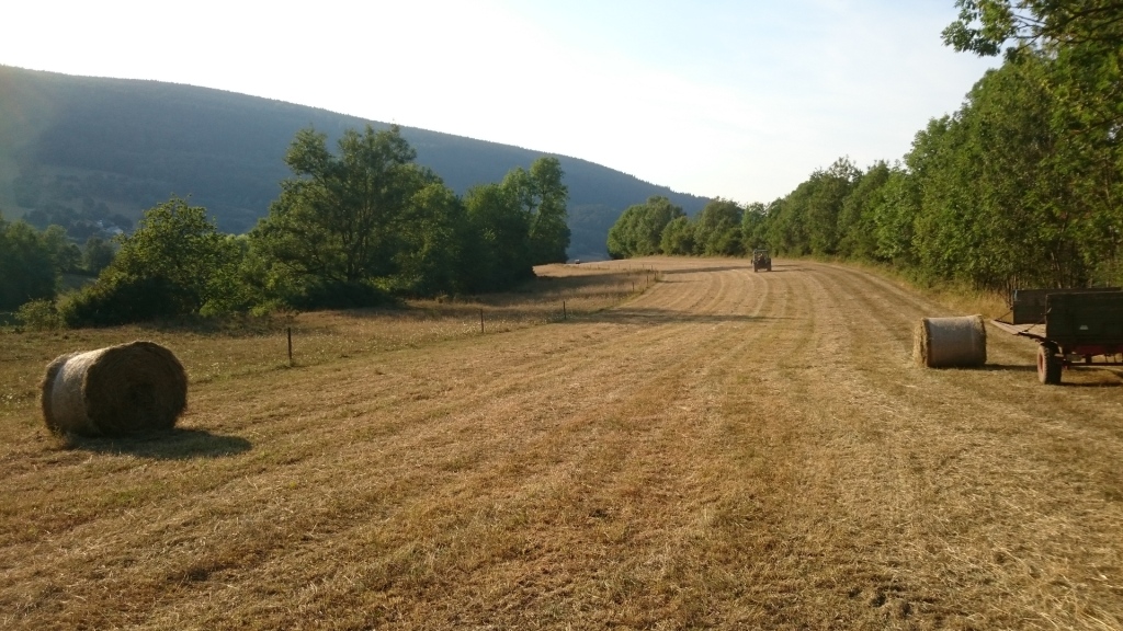 Richtig deutlich wird die geringe Erdauflage bei meiner entfernteren Heuwiese (0,79ha). Da bekommt man nirgends den Bohrstock für Bodenproben komplett in die Erde. Im vorderen Bereich befindet sich darunter Basaltschotter und im hinteren direkt Fels. Die Wiese hat dann zusätzlich noch Süd- West-Ausrichtung. In nassen Jahren praktisch.