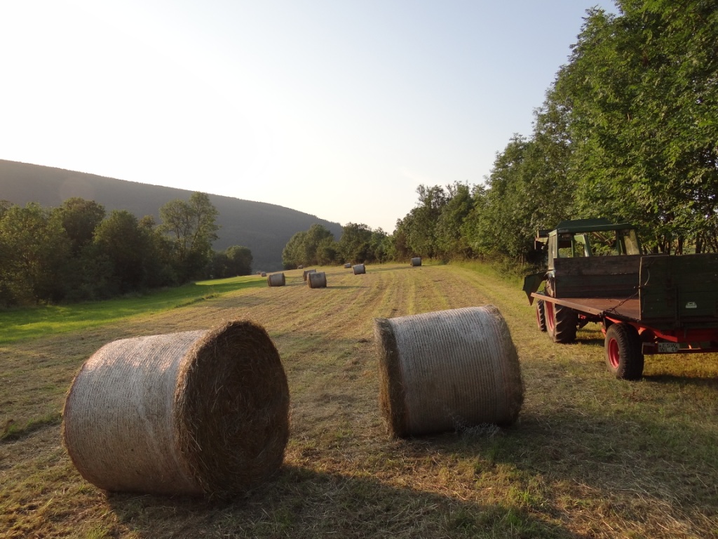Das Bild ist von diesem Jahr, da sind noch keine Ballen abgefahren worden und es ist der erste (wenn auch recht späte) Schnitt. Etwa ein ist als Bröckelverluste auf der Wiese geblieben. Auf dem Foto sind alle Ballen zu sehen: