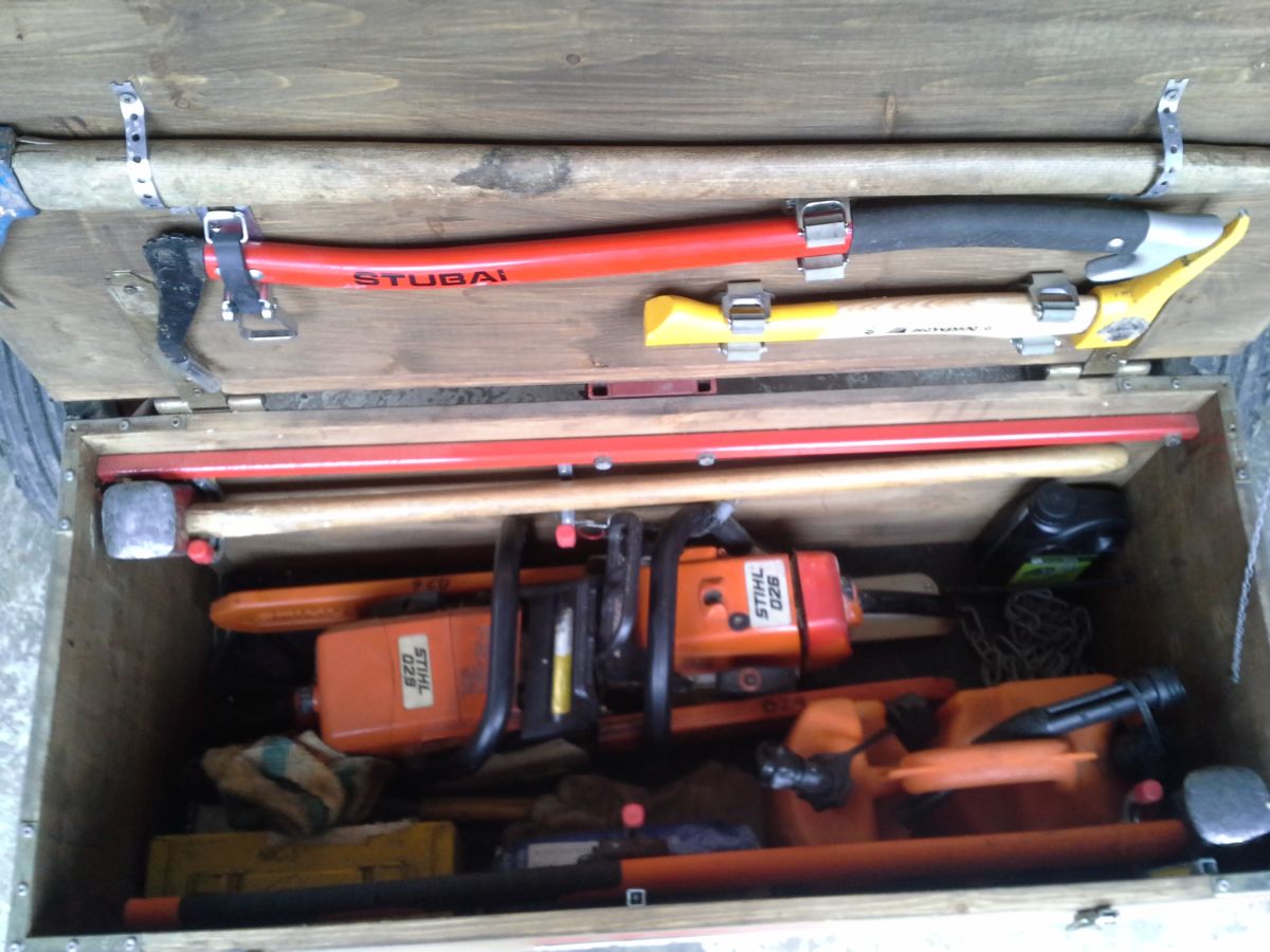eine Hälfte des fertigen Brennholzes sitzt im oberen Teil,der andere vor dem Haus unten
