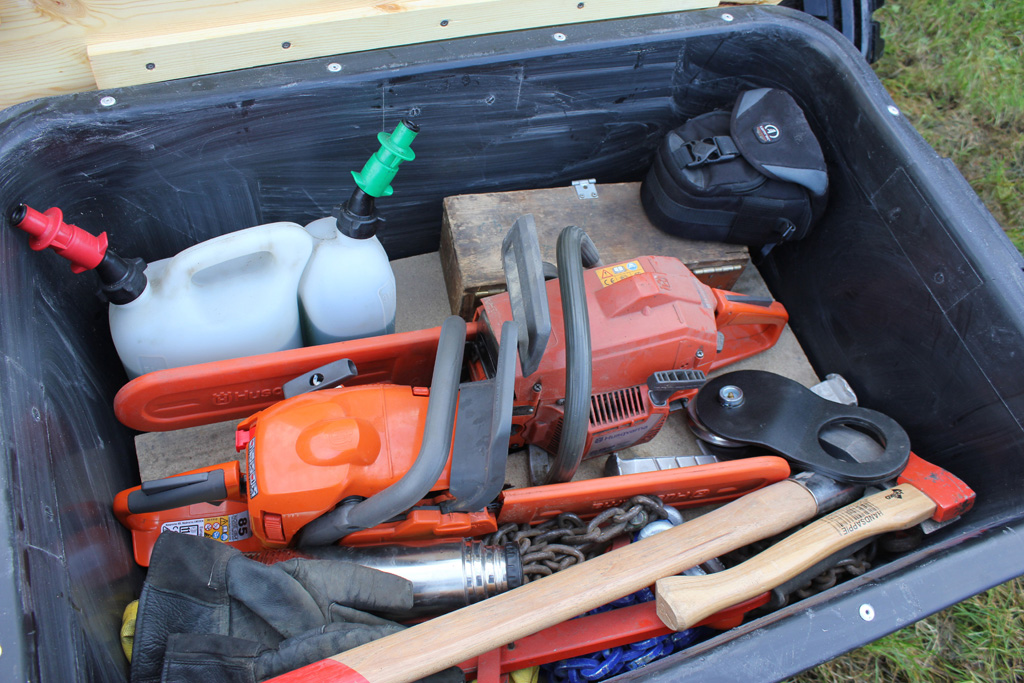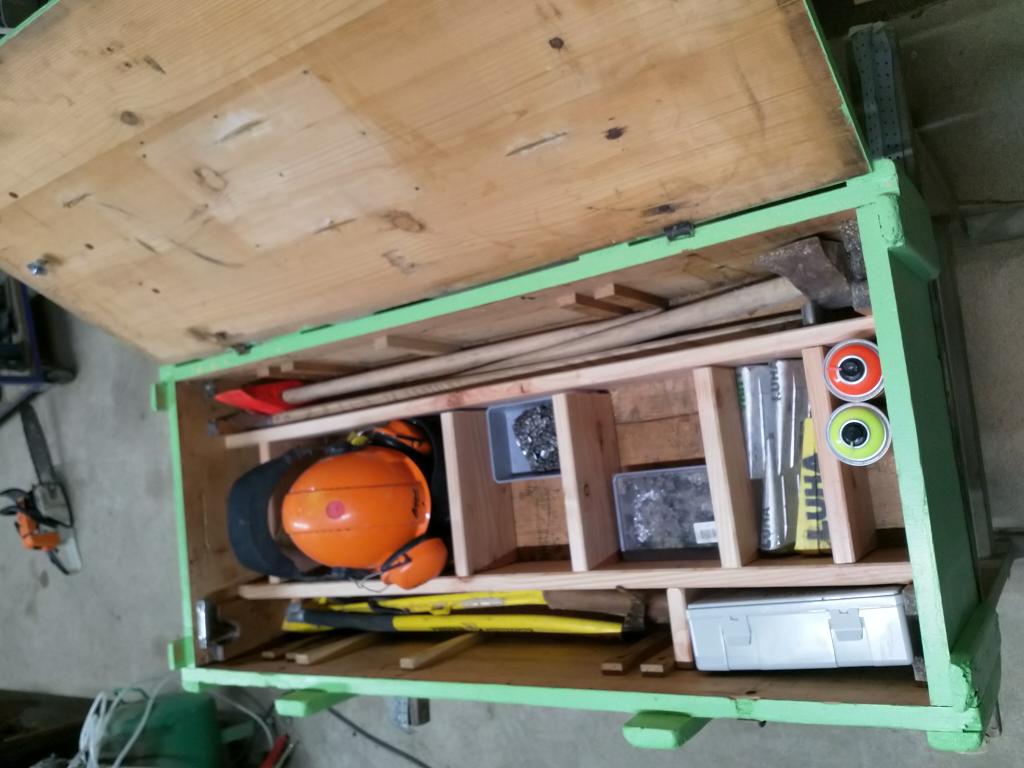 Im Bestand wird die Kiste dann abgestellt. So fahre ich entweder mit Seilwinde (Kiste am Frontlader) oder mit Kipper