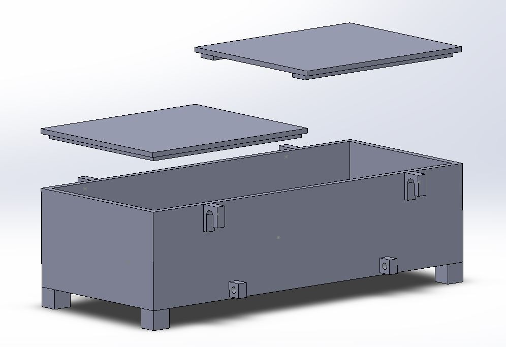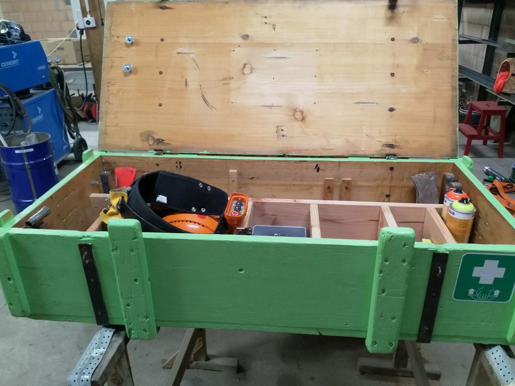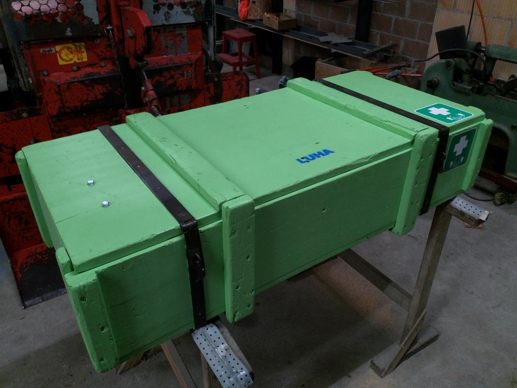 Die Kiste soll am Frontlader transportiert werden. Gegenüberliegend auch mit Euro-Haken versehen damit