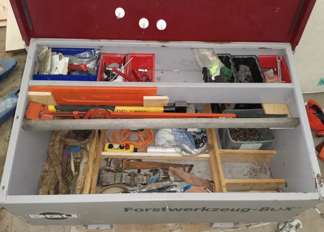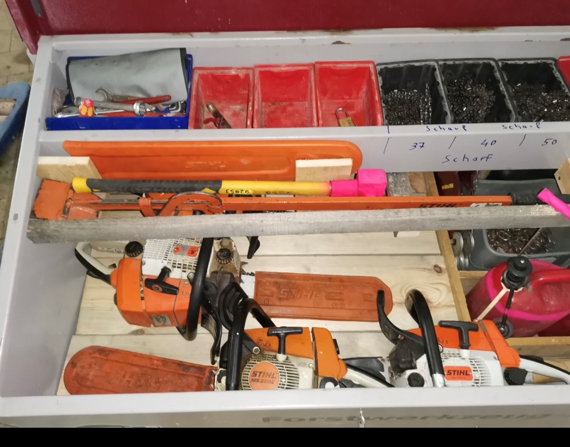 Ich hab knapp 30ha Wald die intensiv genutzt/gepflegt werden. alles im Umkreis von max 1km um den Hof.. An der Winde hängen 1-2Sägen, 2keile im Kettenfach, eine Axt und ein Sappie. Kombikanister mit werkzeugschlüssel dran und fertig.