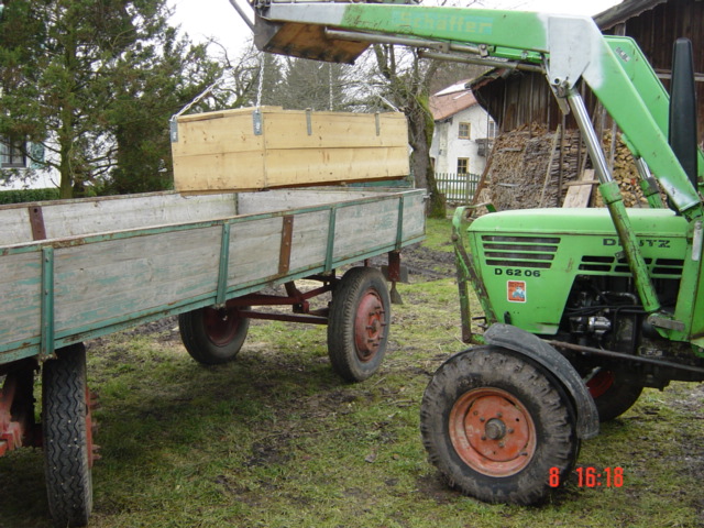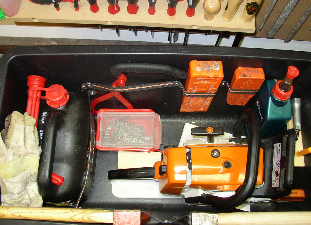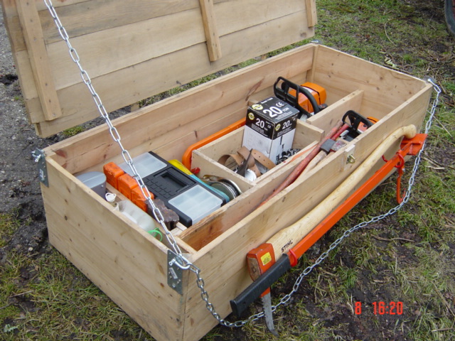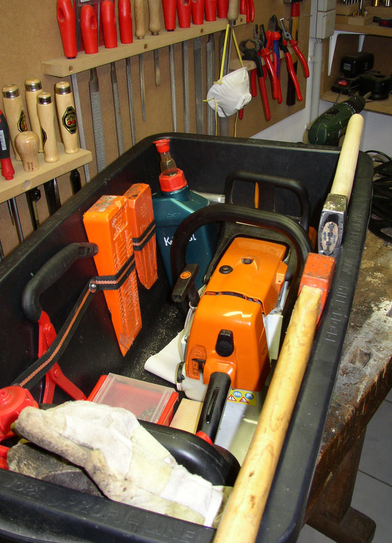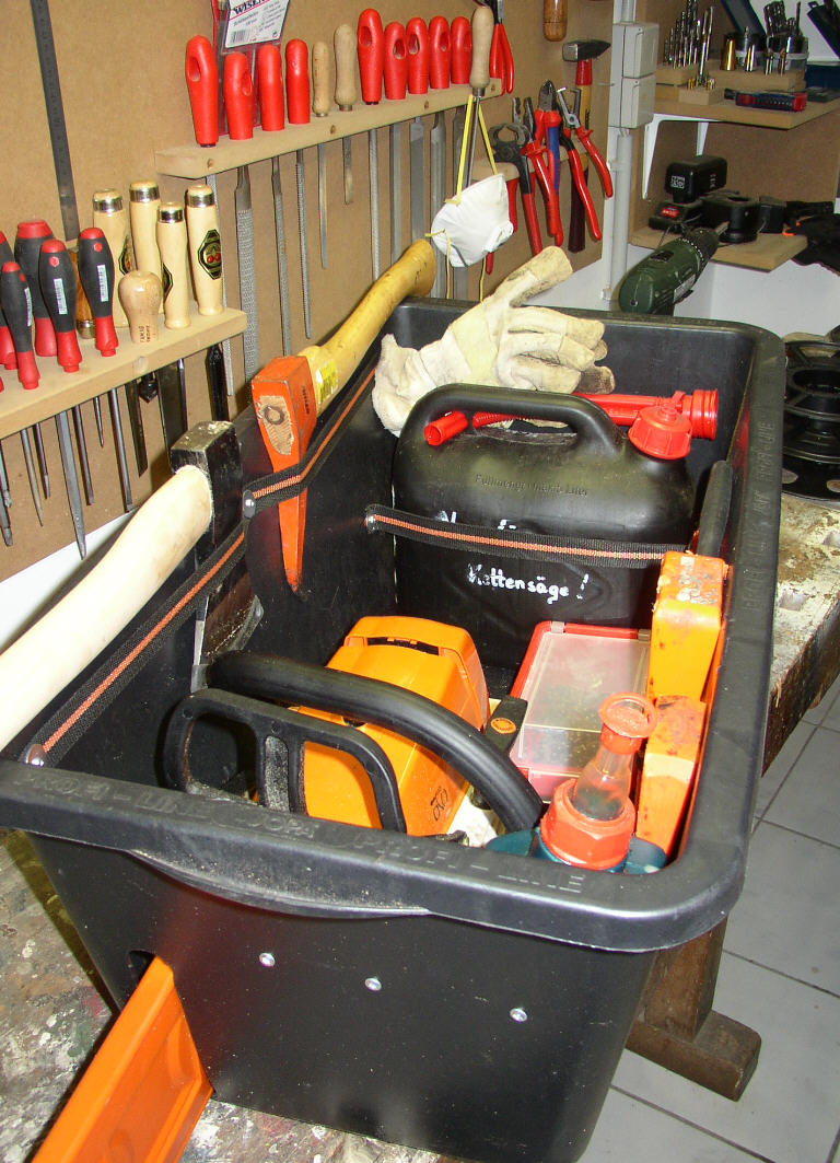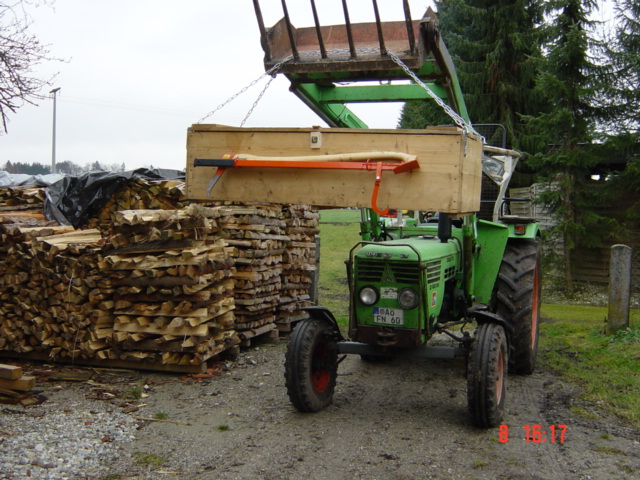 Da war auch eine Kiste dabei, in der eine Säge nur mit dem Schwert hing, Motor ausserhalb (an einem MB-Trac).