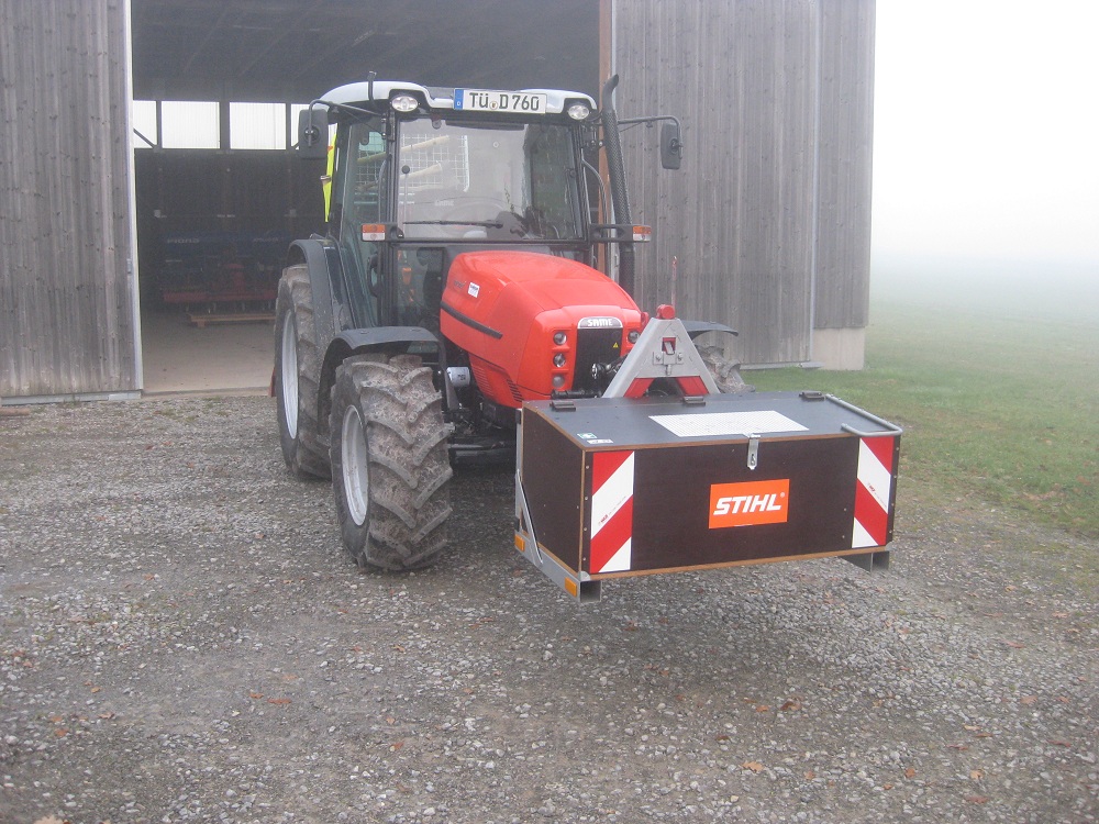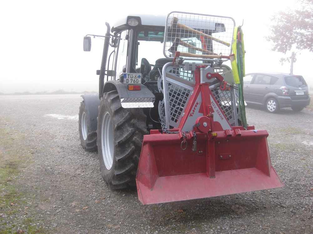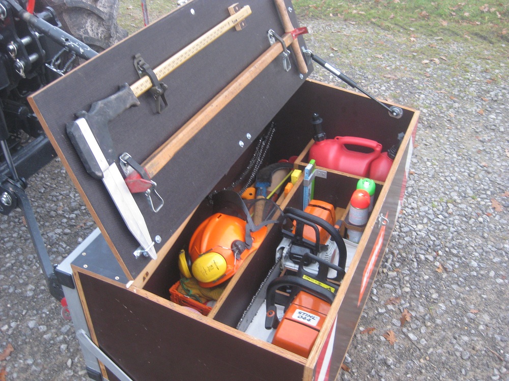 Die Kiste sollte so klein wie möglich und so groß wie nötig werden. Das was rein sollte gab die Größe vor. Freihändig rumtragen ist natürlich nicht mehr möglich und auch nicht gewollt, jedoch an der Fronthydraulik ideal. Übrigens, Spalthammer, Keile, Umlenkrolle und Fällheber sind an der Seilwinde befestigt.