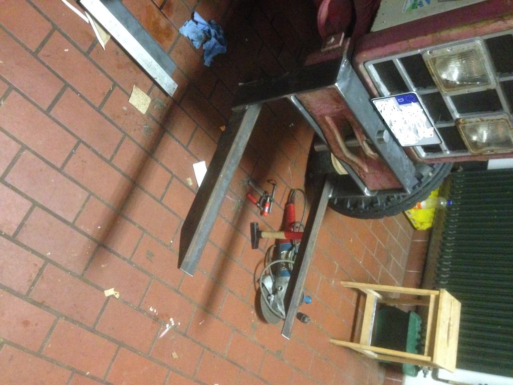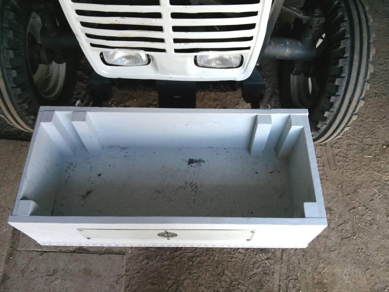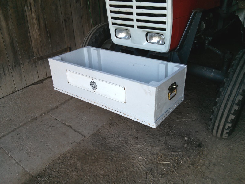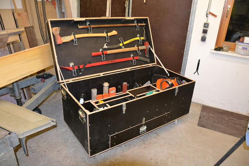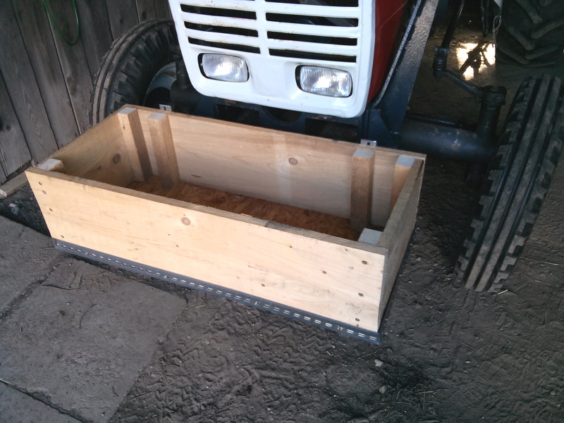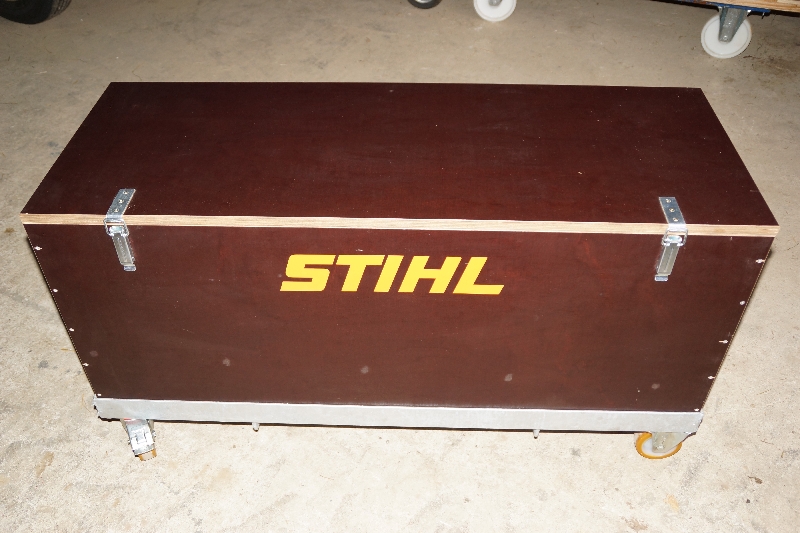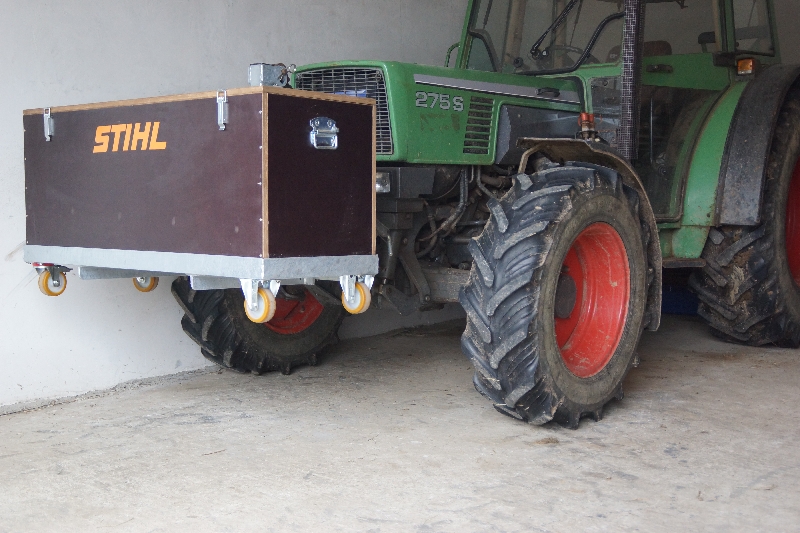 Nun habe ich mich der Notwendigkeit (Gruppenzwang) gebeugt und mir auch eine Transportkiste für Motorsägen/Kleingerät gebaut. Die Kiste hat die Außenmaße B=900 L=400 H=250 / die Innenmaße B=860 L=360 H=220 und ist aus Holz auf einem Grundrahmen aus gelochtem Winkeleisen (2mm) das mit einem U-Profil (6mm) verschweißt ist, das wiederum mit Formrohen 30x30x3 verschweißt ist. Die Rohre passen gerade so schön zur Frontladerkonsole, einfach reinschieben und gut ist. Sicherheitshalber wurden Muttern in die Rohre geschweißt und Schrauben "angefertigt" zum fixieren. Die Kiste selbst ist aus einem Stück 24mm OSB Platte (Bodenplatte), die Seitenwände aus einem 230mm hohen, 20mm starken Fichtenbrett und das ganze wird wiederum mit ein paar 30x40’er Dachlatten Stücken zusammengehalten. Die Dachlatten etwas an der Rückseite etwas abseits vom Rand dienen der Abstützung der Kiste nach hinten zu den stehenden Winkeleisen. Diese sind von hinten durch das Winkeleisen/Brett/Dachlatte geschraubt und die Dachlatte ist von unten durch die OSB Platte mit einer großen Beilagscheibe in diese Dachlatte geschraubt. Die Kiste trägt mich (90Kg) ohne Probleme. Platz für die 346xp, die 024av sowie 5L Benzin, 5L Öl und die kleine Werkzeugtasche mit Feilbock, Feilen und Kleinwerkzeug passen gut hinein. Die 365 mit 45’er Garnitur geht nur quer hinein, da passt keine andere Säge mehr mit rein. Helm kommt auch mit in die Kabine, die Gefahr den zu verlieren ist mir zu groß.