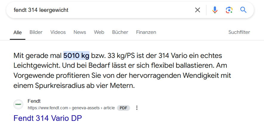 Komatsu1 hat geschrieben:Claas_atos hat geschrieben:Weiß jemand wie hoch das Leergewicht von einem fendt vario 314 Profi wirklich ist? Weil das Leergewicht was fendt angibt ist wahrscheinlich ohne Reifen und Felgen. gg