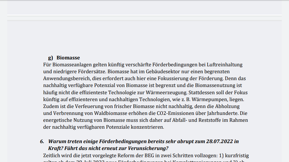 Also falls jemand gerade mit dem Gedanken spielt, dass er eine neue Hackschnitzel oder Scheitholzvergaser einbauen möchte, sollte er sich noch vor 15.08.22 ein Angebot einholen und einen Antrag stellen. Bisher gab es 35% Basisförderung und ggf. 45% bei Austausch einer Ölheizung. Künftig bekommt man nur noch 10 % Basisförderderung und 20% wenn man Öl oder (jetzt neu) eine Gasheizung ersetzt. Also doch deutlich niedrigere Förderung.