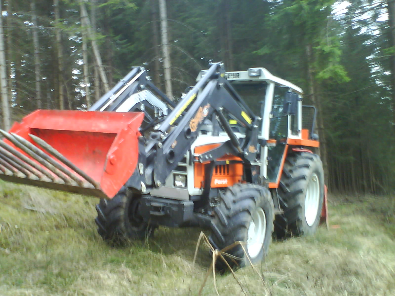 Also wir haben einen Steyr 8080 Turbo Forst mit einer 8to Interforstseilwinde und zum Rücken einen Hauer Frontlader mit Hauer Holzzange!