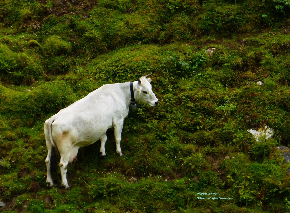 Zum Thema fotogene Rinder möchte ich euch zwei Stück Vieh aus meiner Heimat Tirol zeigen, die es hier offiziell gar nicht geben sollte... Dennoch kamen sie mir diesen Sommer vor die Linse... Und ich war baff.... Einmal das Gurtenvieh (welches im Appenzellerland ja vergleichsweise häufig anzutreffen ist) und einmal das fast schneeweiße Wipptaler Vieh, welches bei der Vereinheitlichung der Grauviehschläge unterging, aber glücklicherweise in Mutterlinien phänotypisch überlebt hat.