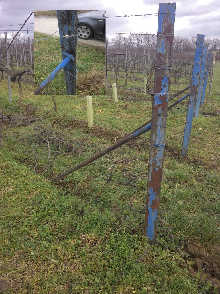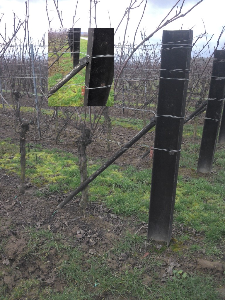Früher wurden bei uns zunächst Sandsteine mit Holzpfahl dahinter, später dann Betonendsteine verwendet. Die Endsteine sind recht gut erkennbar an einem Loch so in Höhe des oberen Biegedrahtes, da stand die Stütze drinnen. War aber nicht so gut für den Vollernter wegen der Schuppen, daher heute nur noch Eisen.