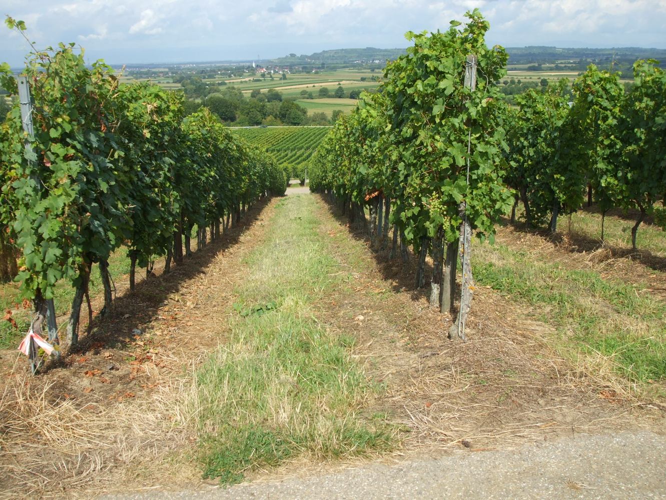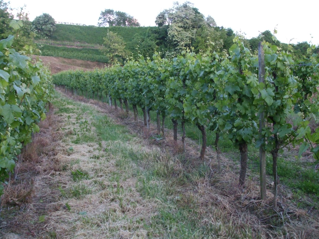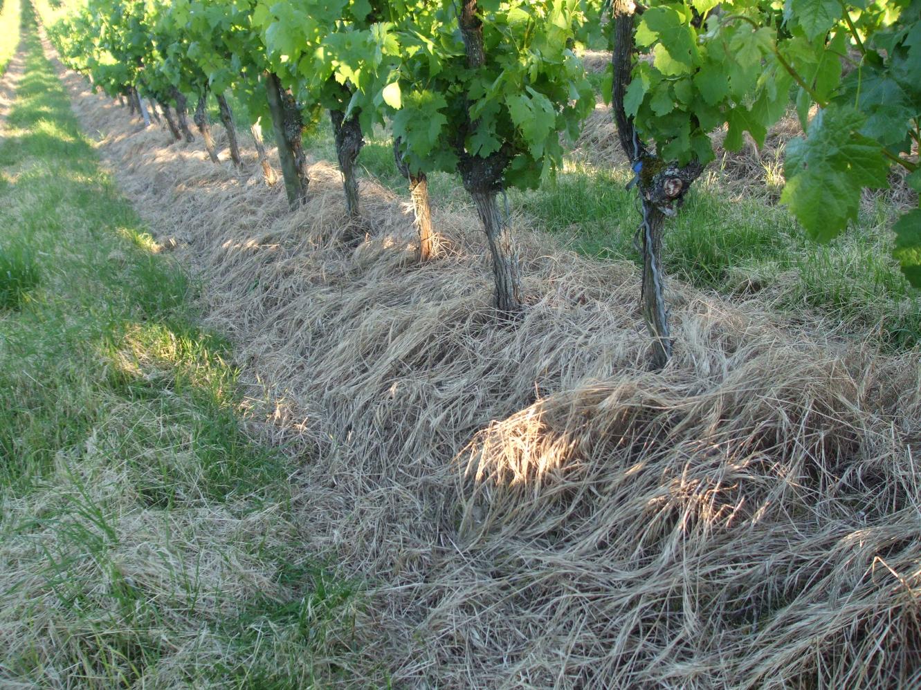 In den Terrassen schneide ich das Holz einmal grob zusammen und lass es als Erosionsschutz längs unter den Stöcken liegen. Was im Frühling an Grünzeug steht wächst durch in die Reben ein. Dann wird zum Austrieb der Boden abgespritzt und alles bleibt wie eine Filzmatte liegen. Es geht so auch ohne Mulcher und Häcksler und vor allem ohne das anstrengende Rausschaffen und Verbrennen von Rebholz. Nach zwei Jahren ist es morsch, dass es von selbst zerbricht. Es kommt immer wieder eine neue Lage Holz oben drauf. Für den Humusaufbau ist es optimal und Trockenstress ist nur in Junganlagen oder bei ganz geringer Bodenauflage noch ein Thema.