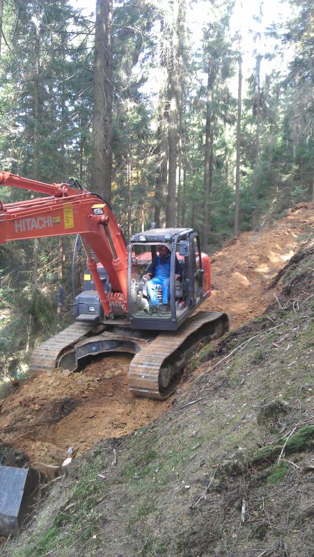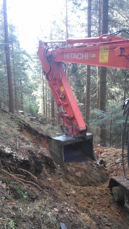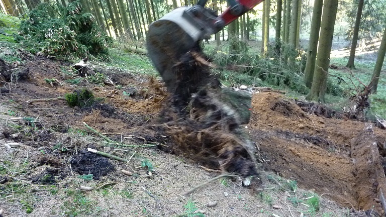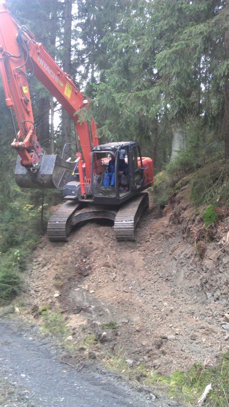 kpl. Teller in die Böschung als Stütze mit einarbeiten. Planieren mit der Bergstütze des Baggers.