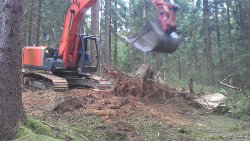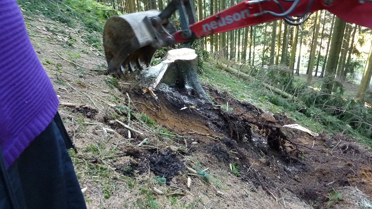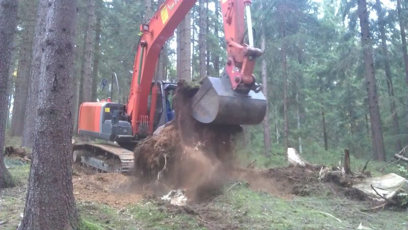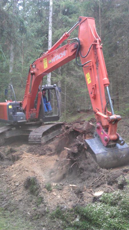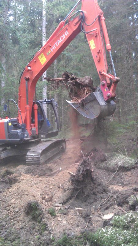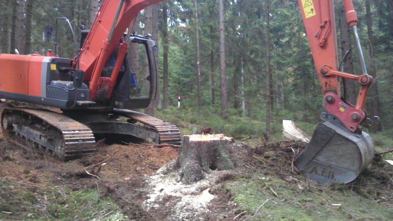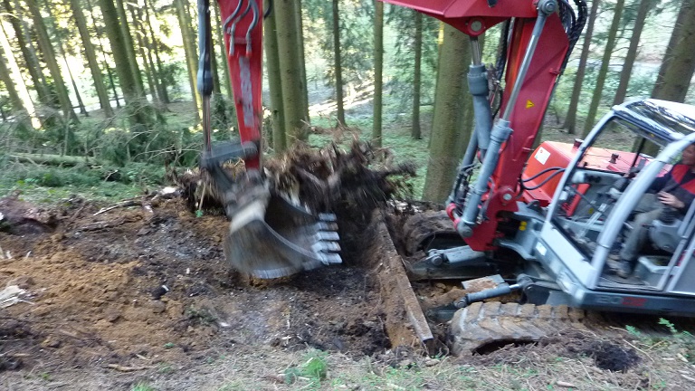 Und ob das mit einem Bagger gut geht. Da schau mal hier. Einmal links vom Stubben gegriffen, einmal rechts und einmal dahinter - fertig. Die Bergstütze kann der Bagger auch gleich zum Planieren benutzen.