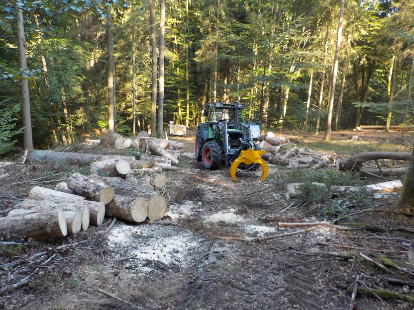 Für die ca. 80 Ster im Jahr kommt ein John Deere 5055 mit MX Frontlader sowie unser treuer Fendt GT 25 mit Frontlader oder Pritsche zum Einsatz. Aktuell arbeiten wir nur mit Seilwinde, Ballengabel an GT/John Deere oder heben die Meterstücken händisch auf die Kipppritsche des GT. Mit letzterem soll nun Schluss sein!